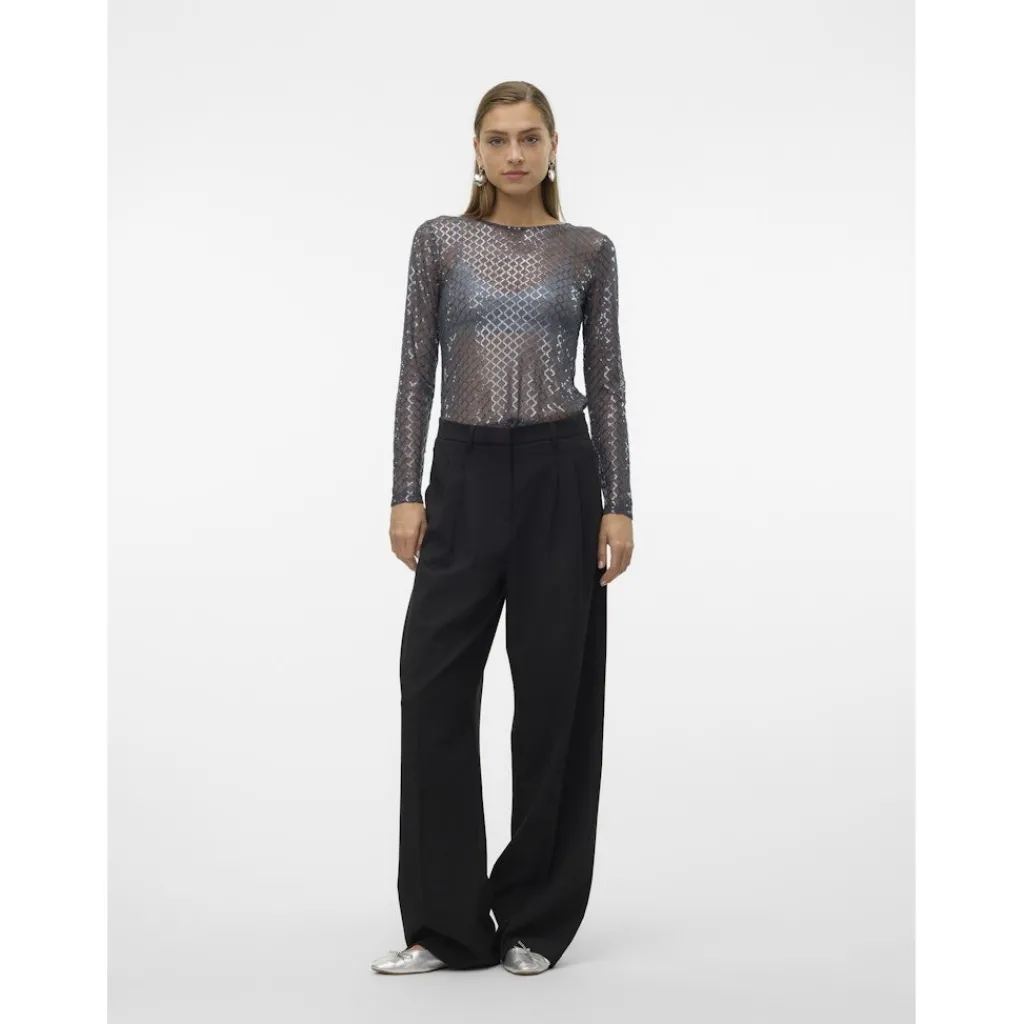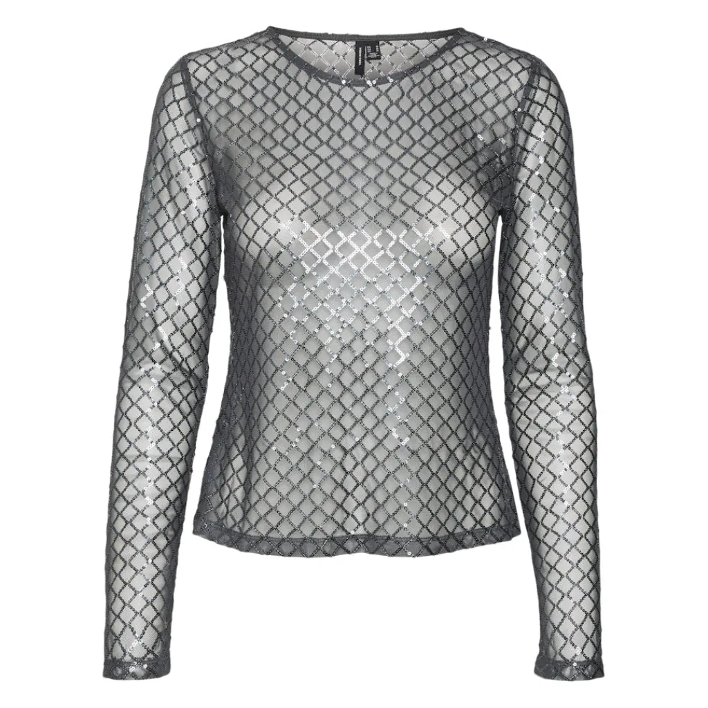 Sej, let gennemsigtig meshbluse fra Vero Moda. Blusen kan styles med matchende bukser fra samme serie for et komplet festligt look.