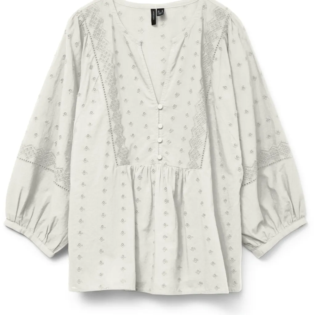 Unik, smuk bluse fra Vero Moda med de fineste detaljer og mønster. Blusen har en dyb v-udskæring, sofistikerede knapper og tunge ballonærmer. Brug den til både jeans og nederdele.