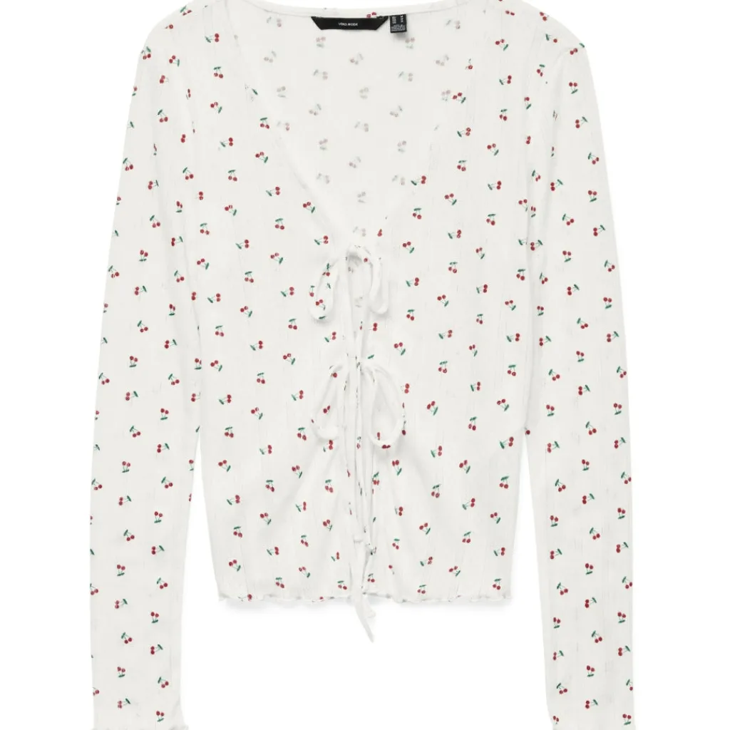 Sød cardigan med små kirsebærmotiver fra Vero Moda. Blusen har det fineste mønster og bindebånd, og der er en smule smock ved håndleddene og kanten af blusen.