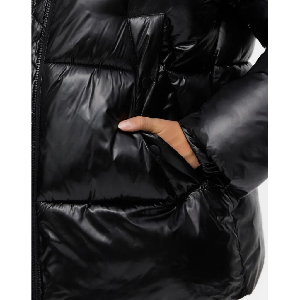 Kort jakke med lynlås og rundet krave, designet med lange ærmer og korte længde. Praktiske lommer foran med trykknap gør den funktionel og stilren.