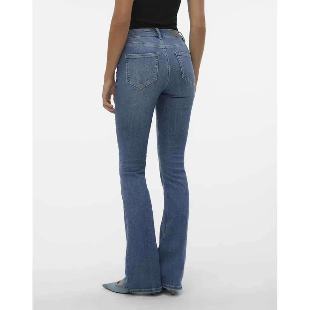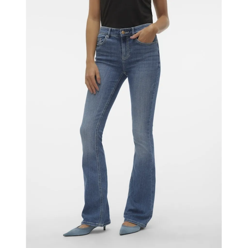 Flare jeans fra Vero Moda. Buksen sidder strammere ved hofte og lår, og bliver bredere fra knæet og ned. Et must-have til hverdagsgarderoben.