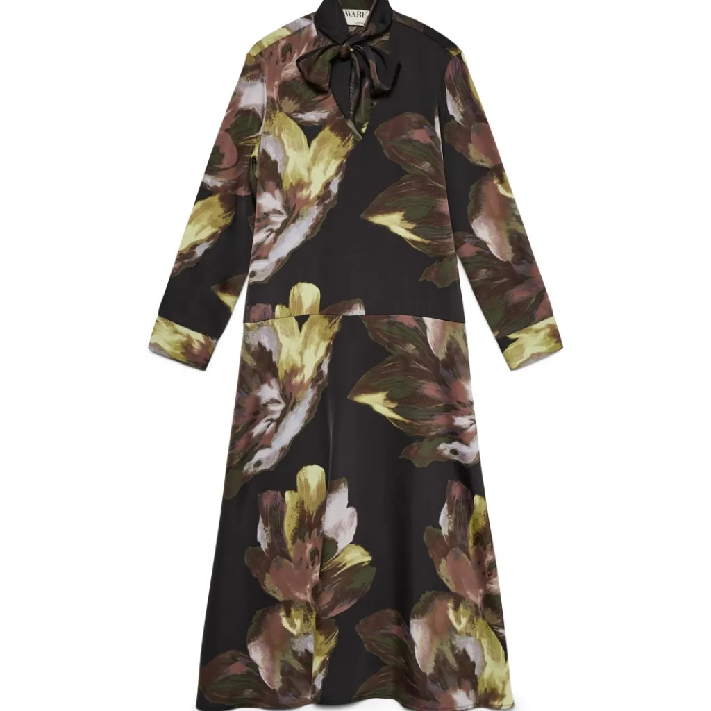 Lang maxi-kjole med lange ærmer og knyttet hals, afslappet pasform og bindelukning. Perfekt til fester med elegante accessories og høje hæle.