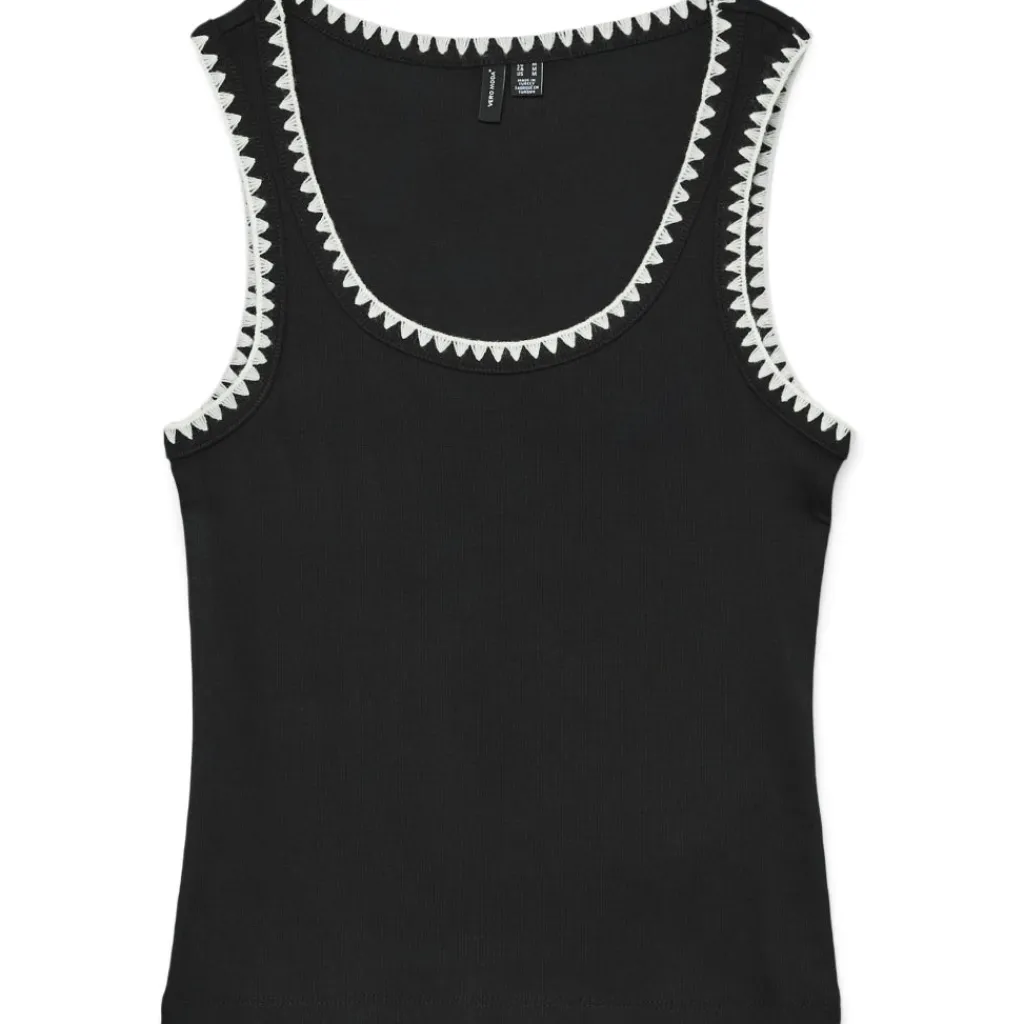 Den fineste tank top med rund hals og seje kontrastsyninger. Kan både bruges under en åben skjorte på de køligere dage eller alene på en varm sommerdag. Den kan styles med både jeans og nederdele.