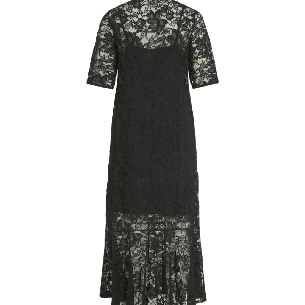 Den smukkeste blondekjole der går lidt ud forneden og har bindebånd ved halsen. Den har en kort underkjole.