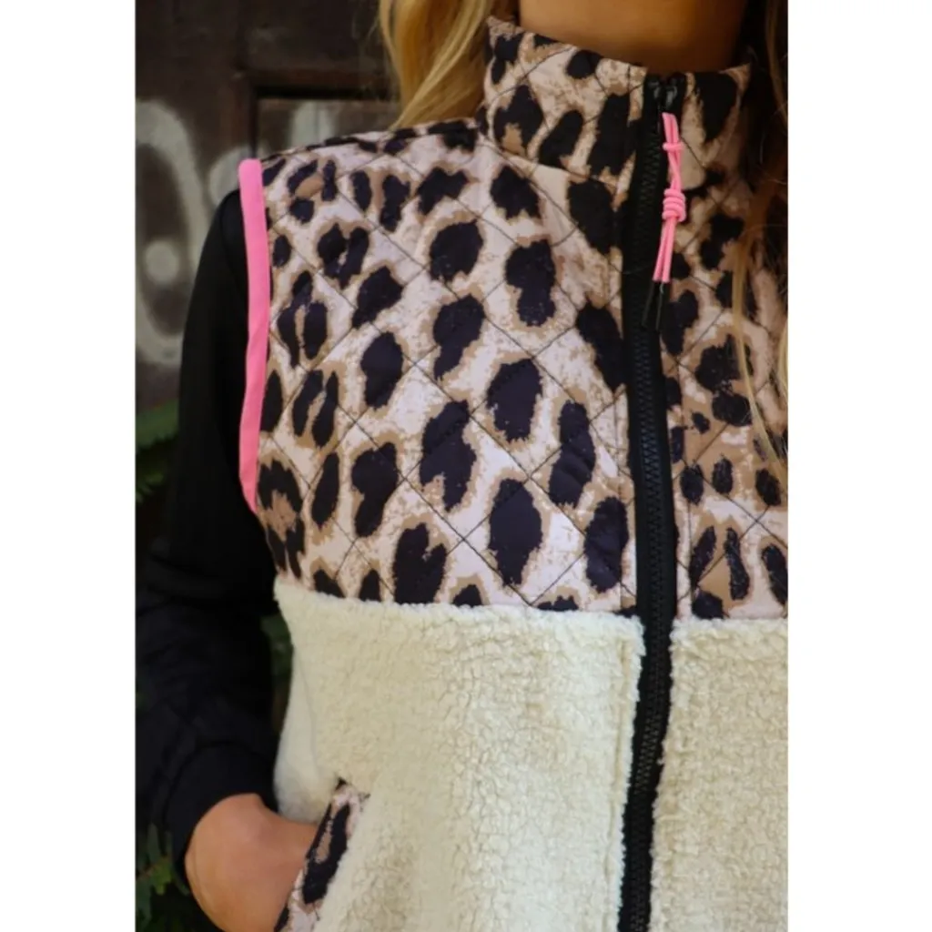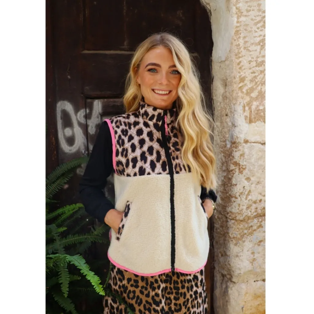 Cool, trendy teddy vest fra Liberté i leoprint. Vesten har seje lyserøde kontrastsyninger, hvilket giver en super fed effekt. Den har lommer og lynlås, og kan bruges med en basis t-shirt eller langærmet under for et komplet lag-på-lag look.