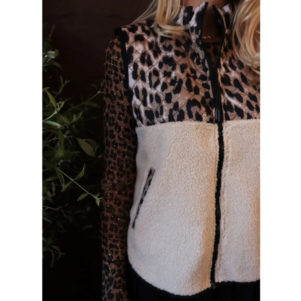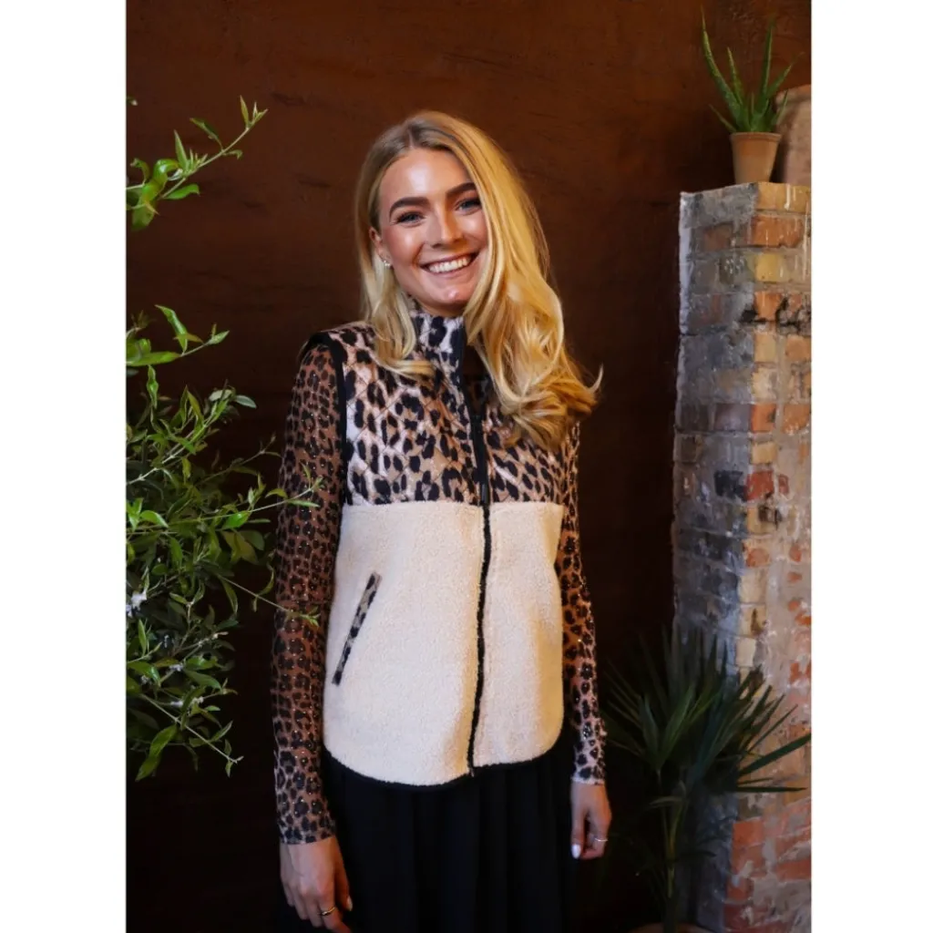Cool, trendy teddy vest fra Liberté i leoprint. Vesten har seje lyserøde kontrastsyninger, hvilket giver en super fed effekt. Den har lommer og lynlås, og kan bruges med en basis t-shirt eller langærmet under for et komplet lag-på-lag look.