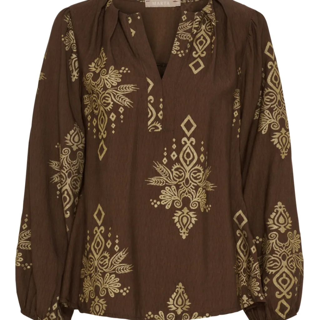 Smuk bluse fra Marta du Château i det fineste print. Blusen har en løs pasform, V-hals og elastik ved ærme. Den kan både styles med et par jeans, en nederdel eller bukserne, som passer til.