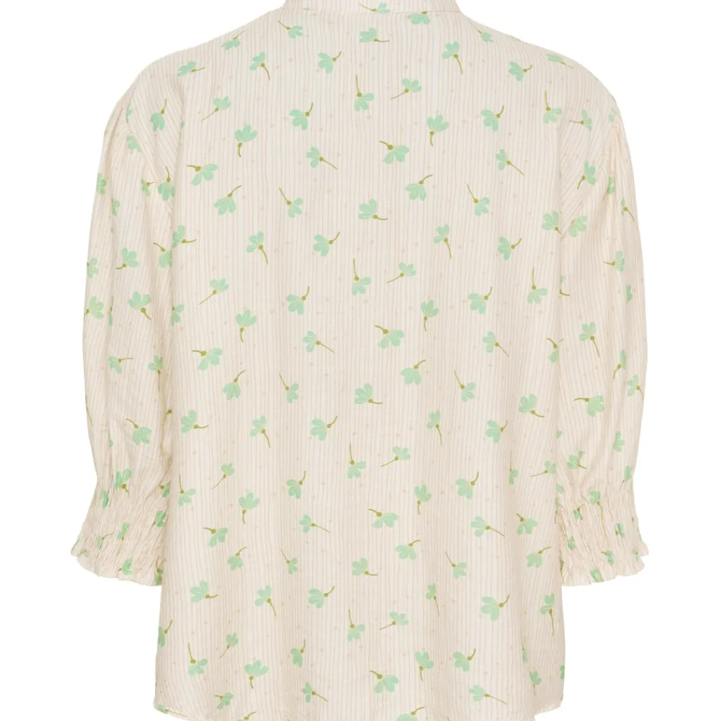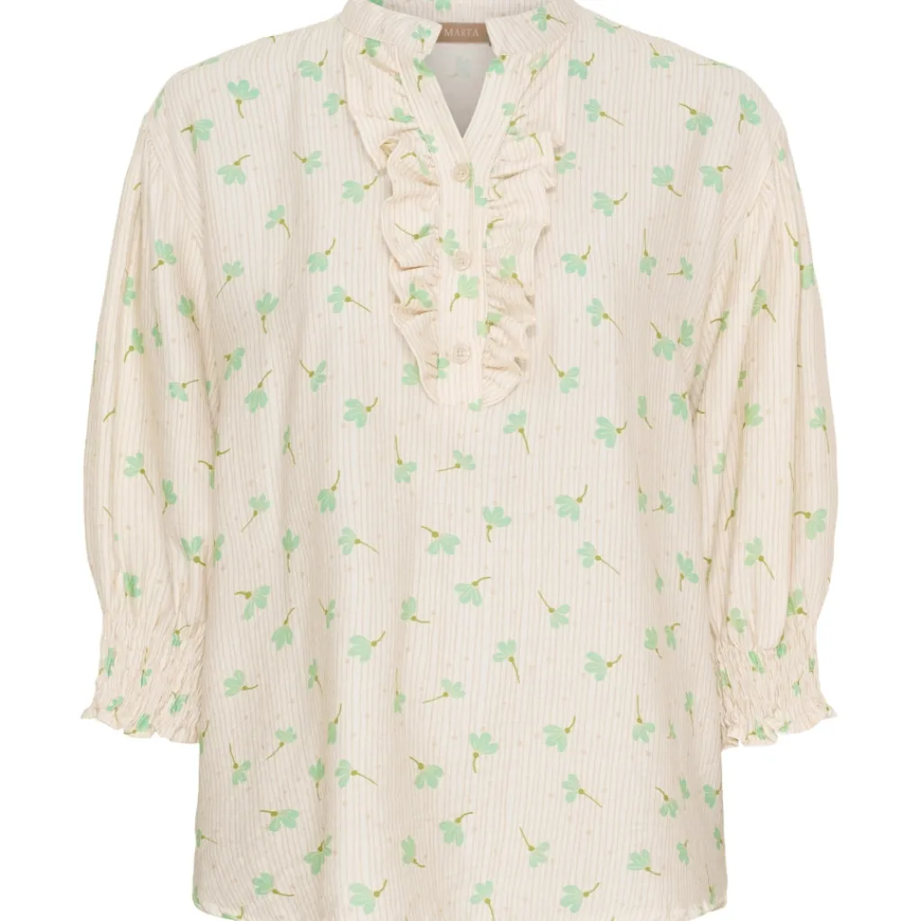 Femin og elegant bluse fra Marta Du Château. Blusen har v-hals, smock ved ærmerne og en enkel flæsedetalje langs halsen. Style den med matchende bukser fra samme serie for et fint sammenhængende look.