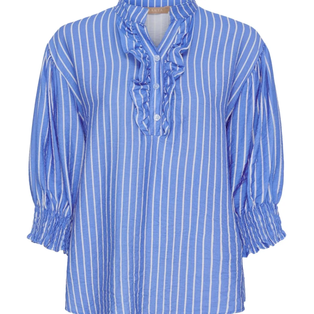 Femin og elegant bluse fra Marta Du Château. Blusen har v-hals, smock ved ærmerne og en enkel flæsedetalje langs halsen. Style den med matchende bukser fra samme serie for et fint sammenhængende look.