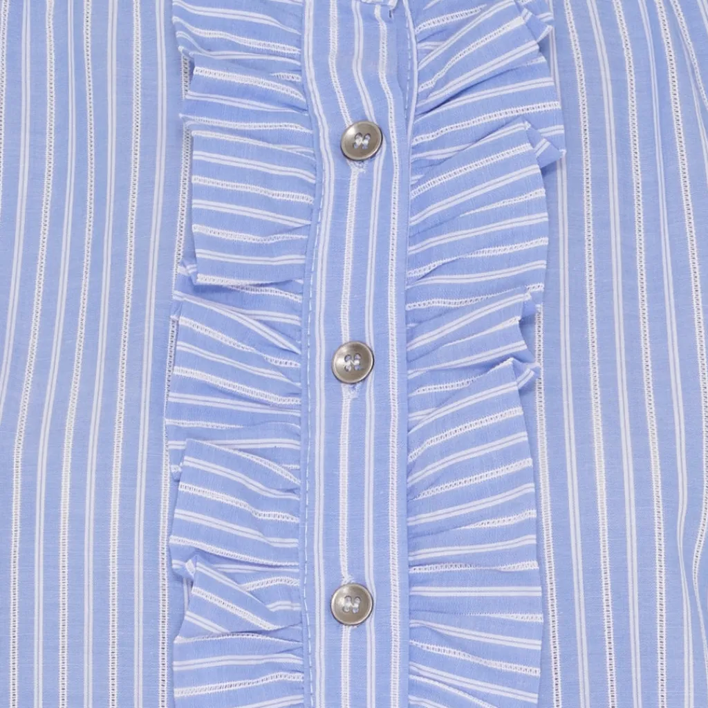 Smuk stribet bluse med fine flæsedetaljer og knapper. Blusen har en lidt høj krave, og den kan både styles til jeans & sneakers og nederdele & ballerinaer alt efter anledningen.