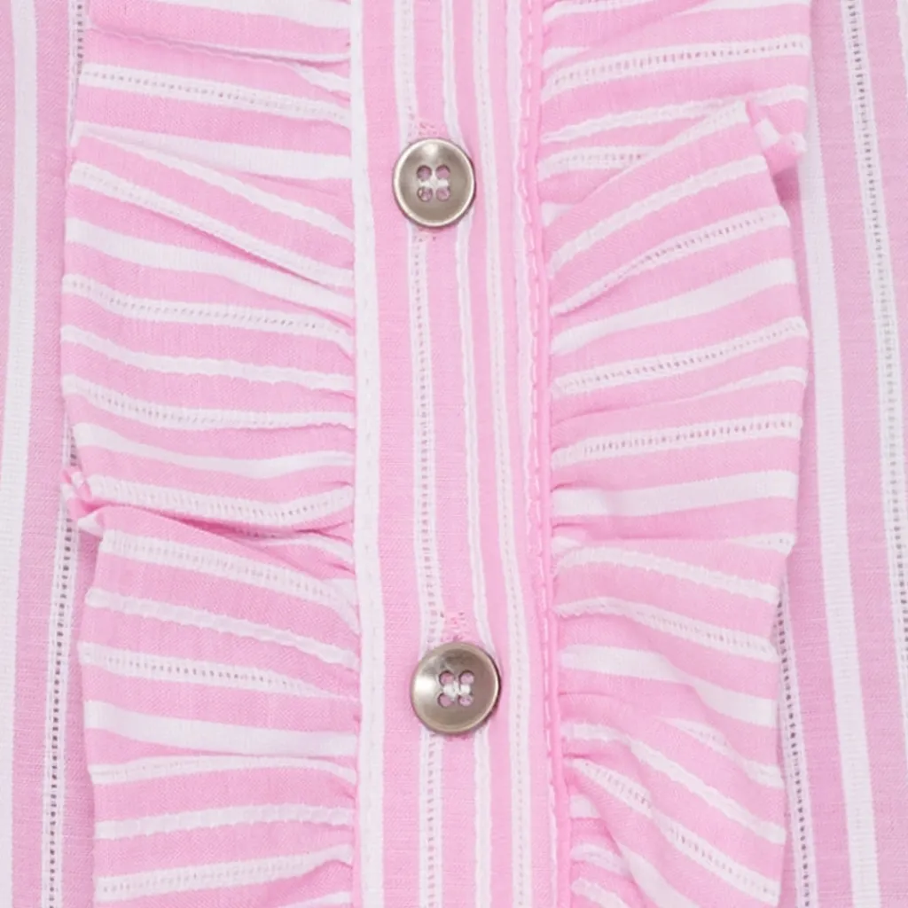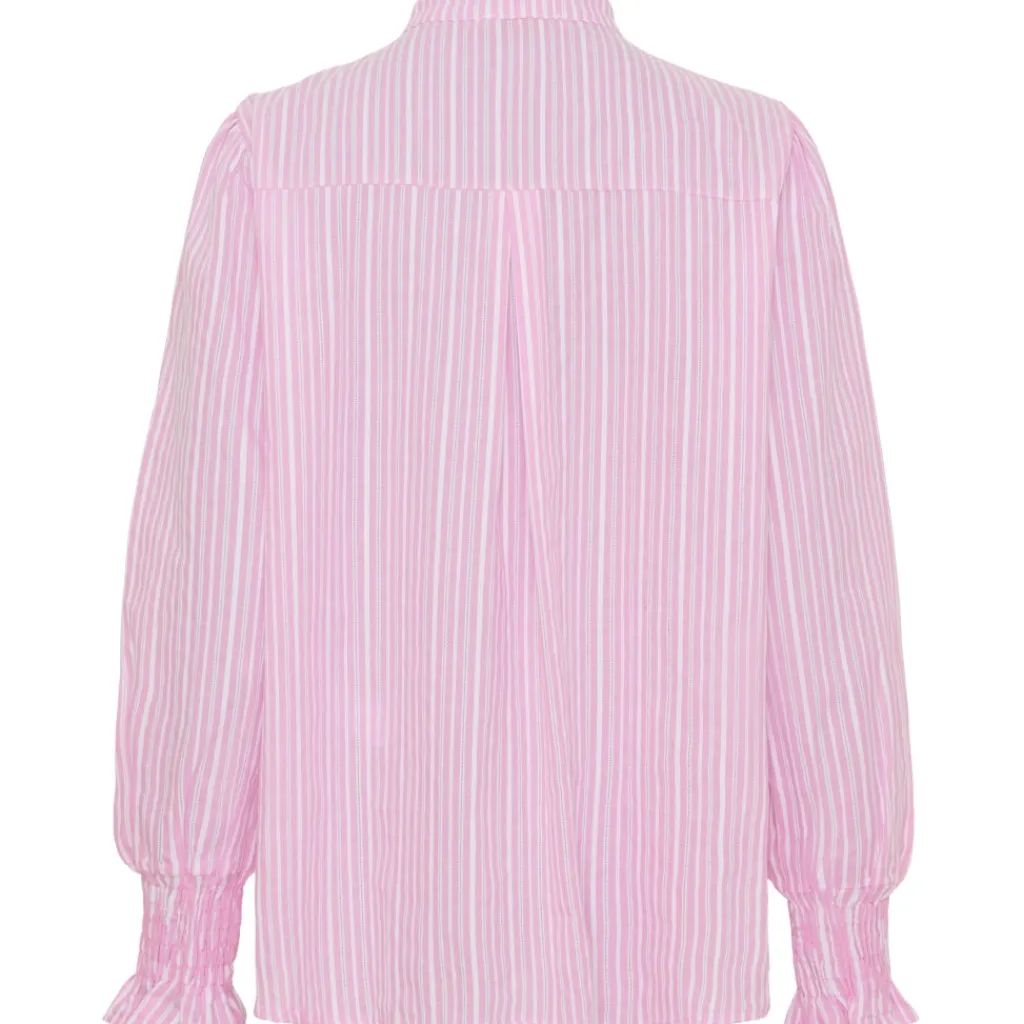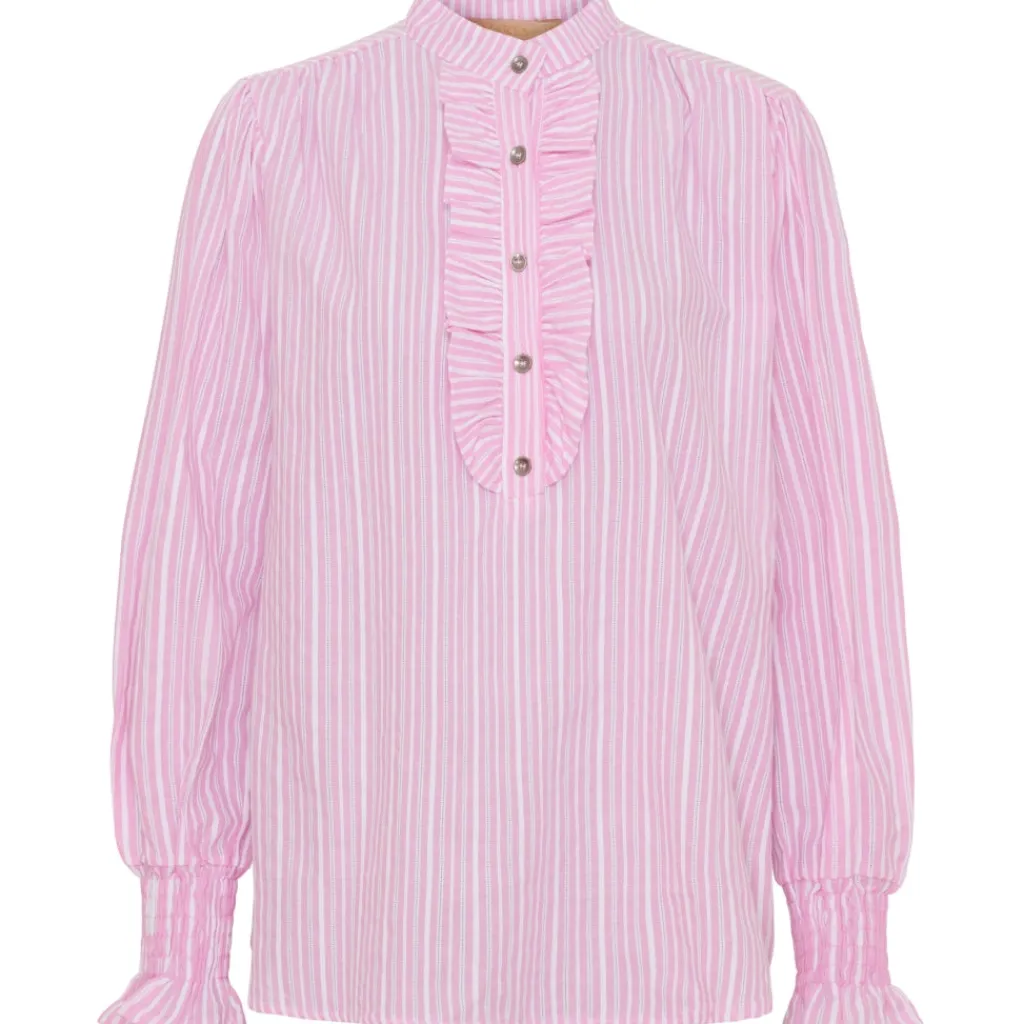 Smuk stribet bluse med fine flæsedetaljer og knapper. Blusen har en lidt høj krave, og den kan både styles til jeans & sneakers og nederdele & ballerinaer alt efter anledningen.