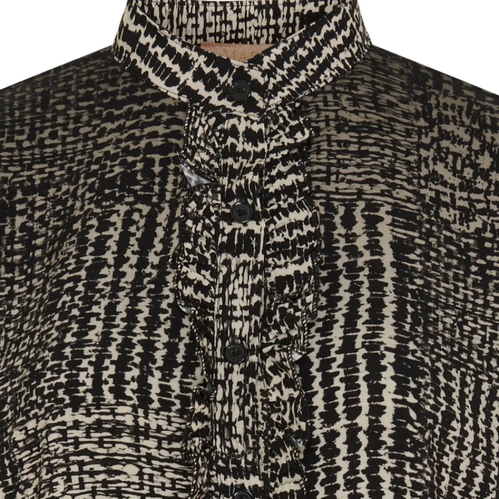 Midikjole med flæser og knapper, samt smock ved ærmerne.