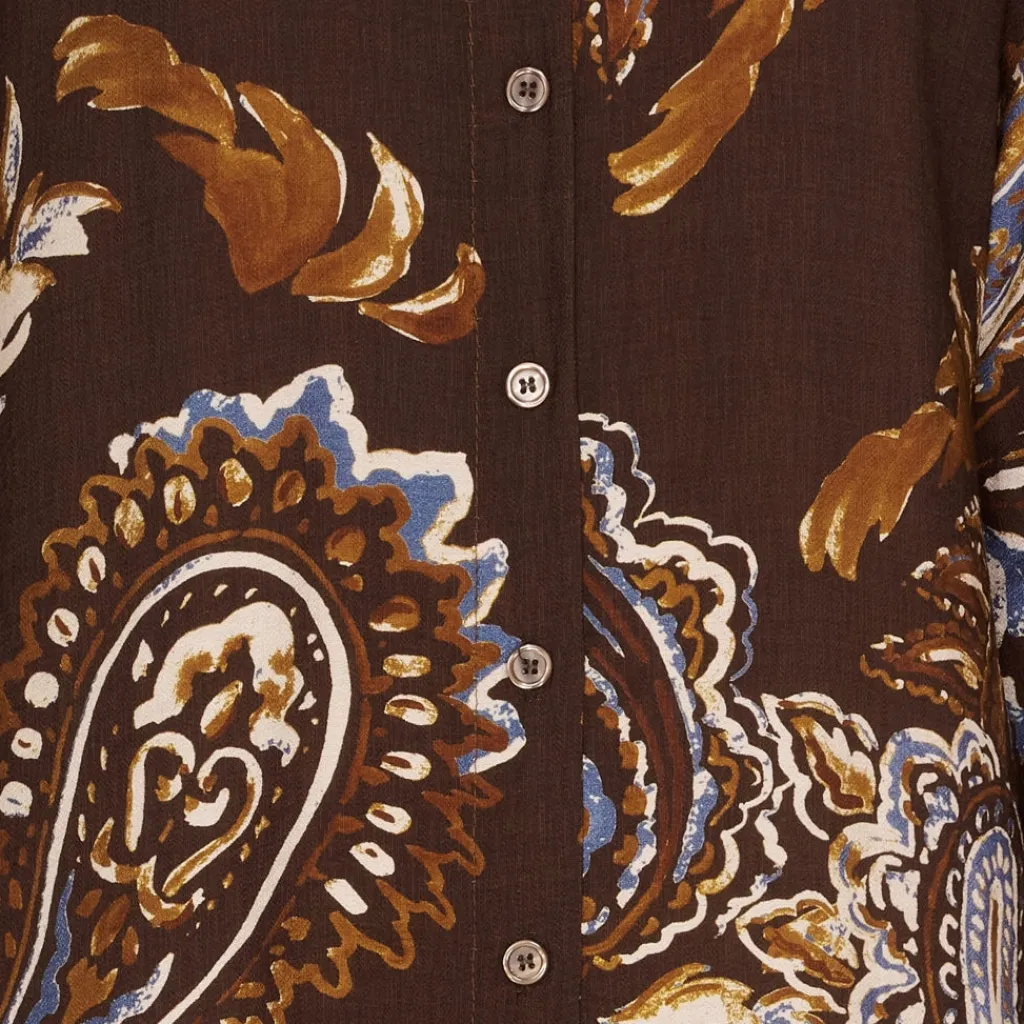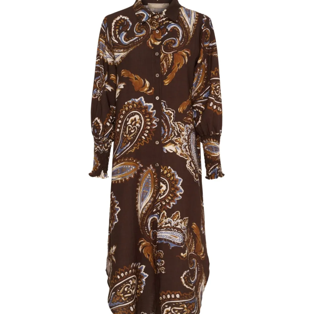 Smuk og elegant printet kjole fra Marta Du Château. Kjolen er gennemknappet, har krave og smock ved ærmer. Kan bruges til både hverdag og finere brug.