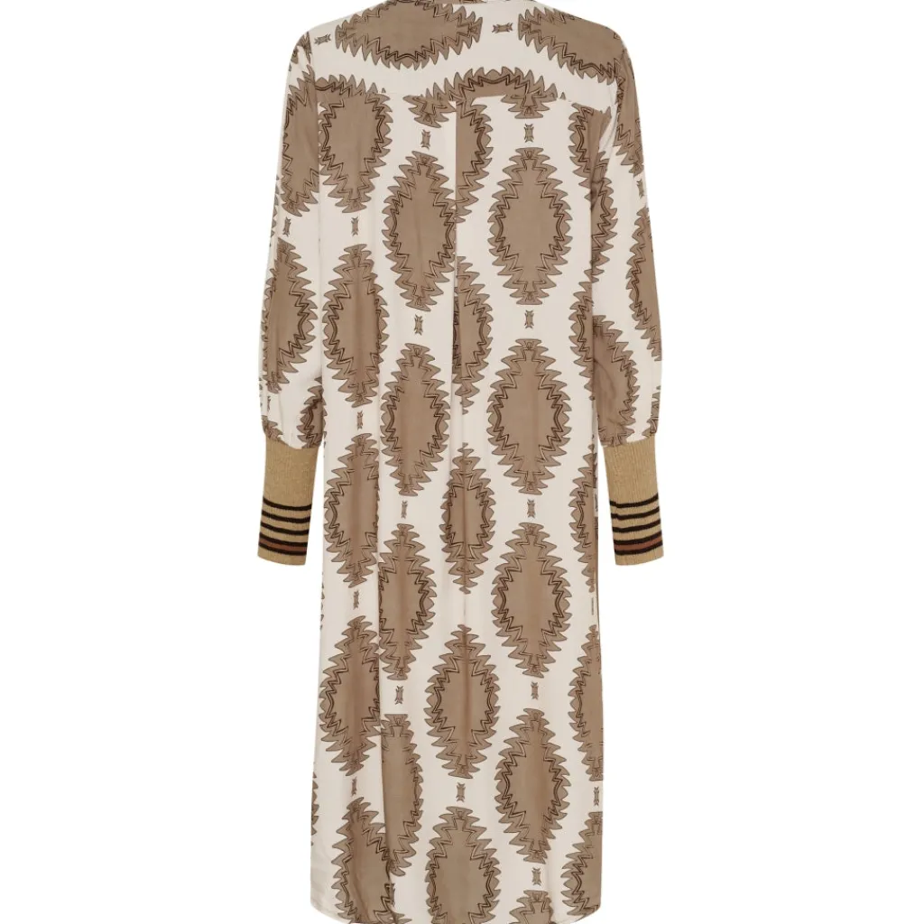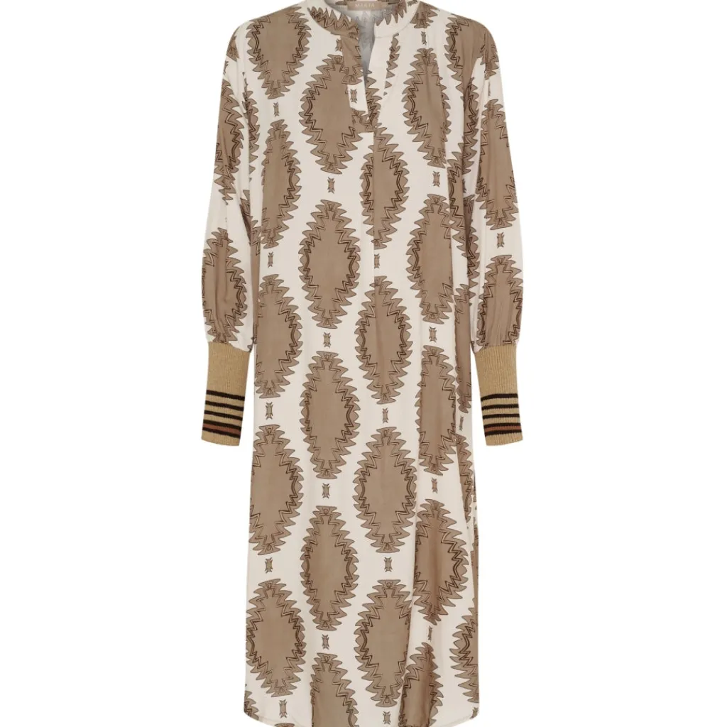 Flot kjole fra Marta Du Château i smart print. Kjolen har V-udskæring med en lille krave og ribkant ved ærme. Kan styles med både sneakers, sandaler eller et par støvler.