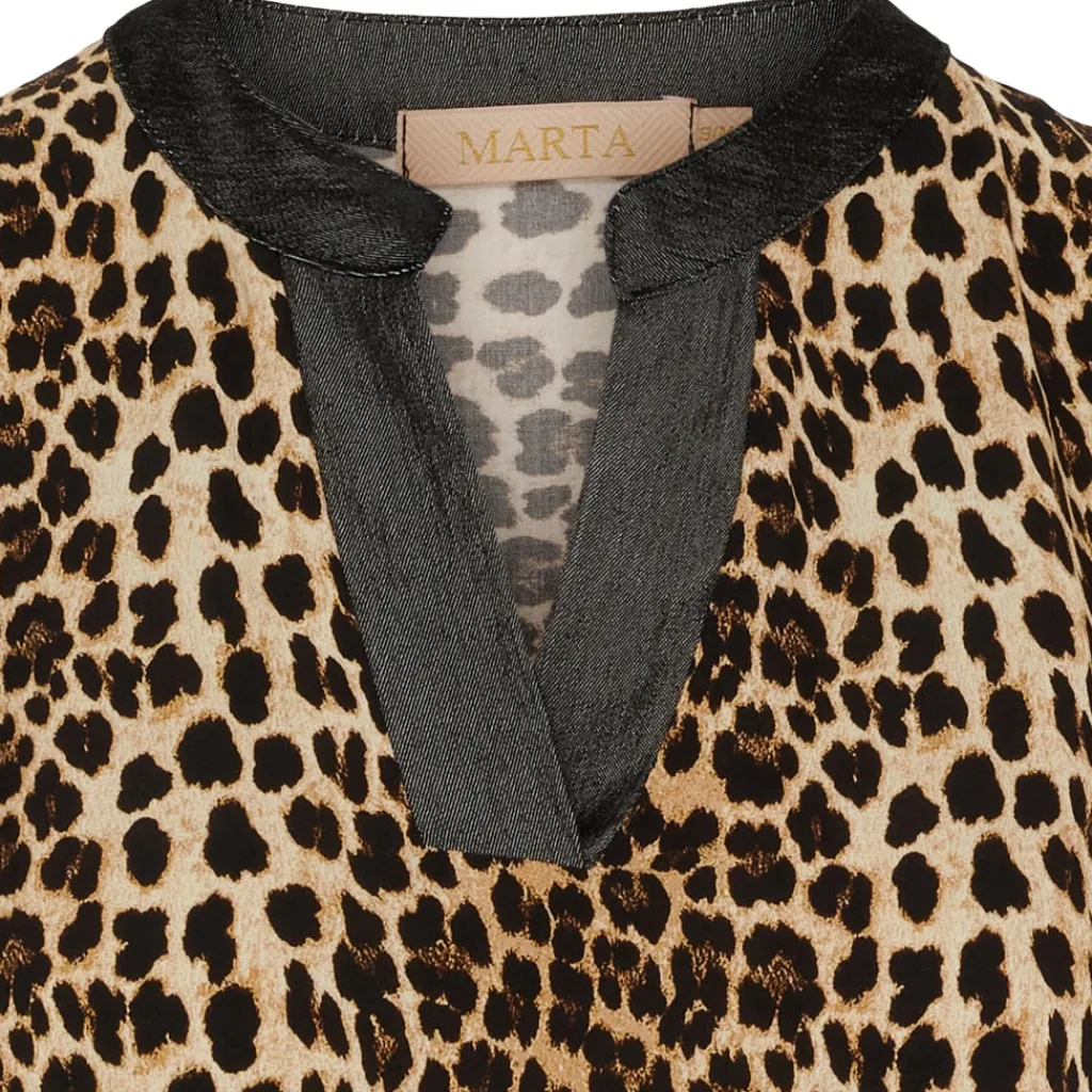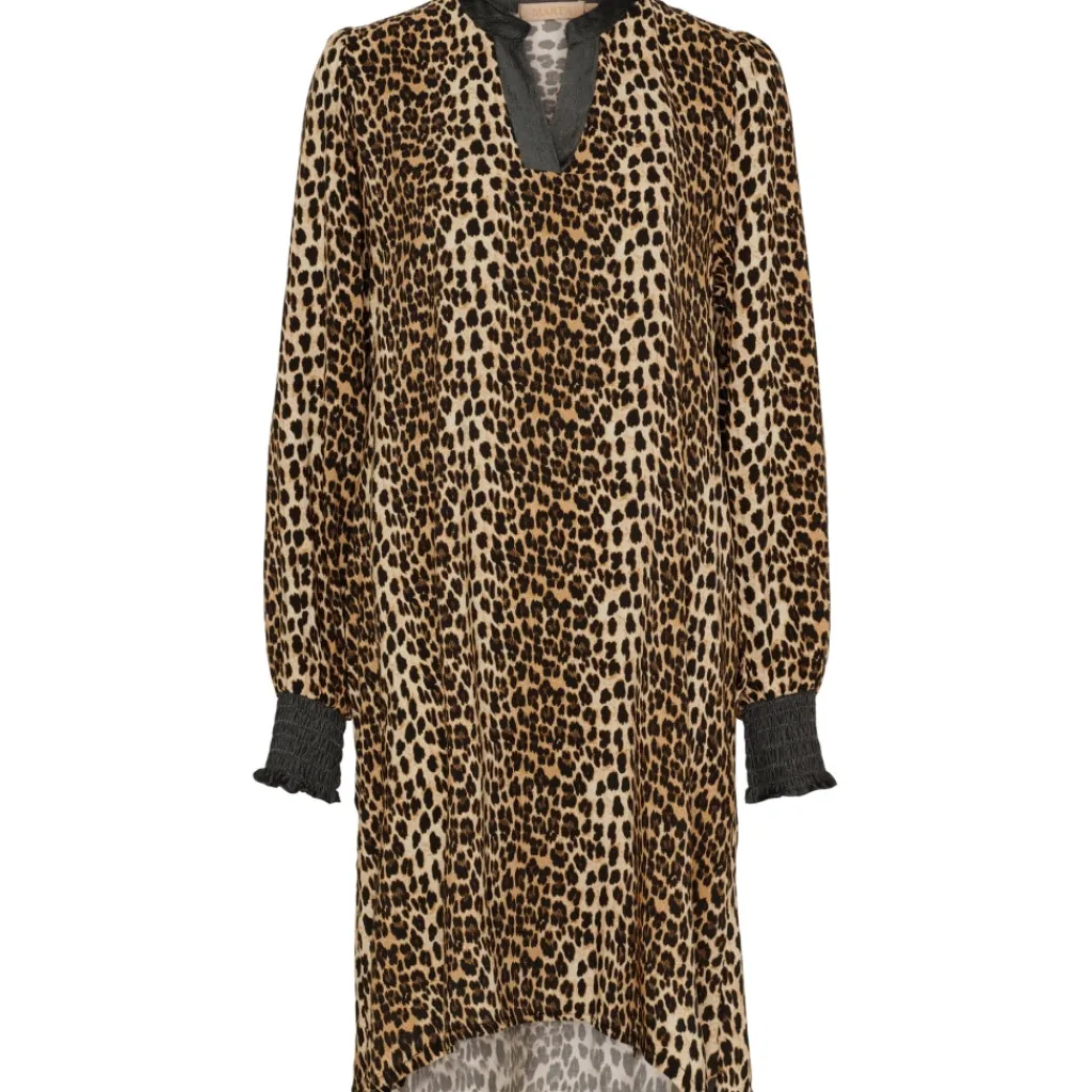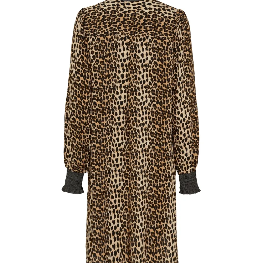 Smart leopardkjole med v-hals og smockdetaljer fra håndleddene fra Marta du Château. Kjolen er en smule længere bagtil end foran for en fed effekt.