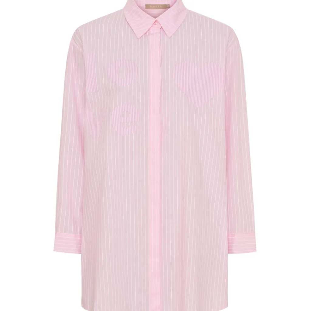 Fin og elegant stribet skjorte fra Marta Du Château med seje detaljer. Skjorten har knapper langs fronten og en klassisk krave, og er ideel til både hverdag og finere brug. Der er mulighed for både at dresse den op og ned alt efter anledningen. Super komfortabel og rar at have på.