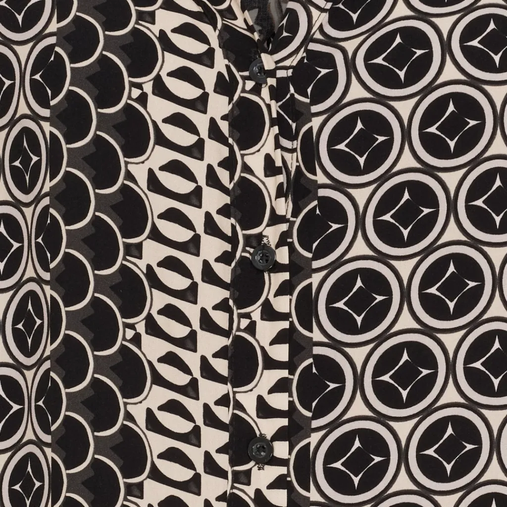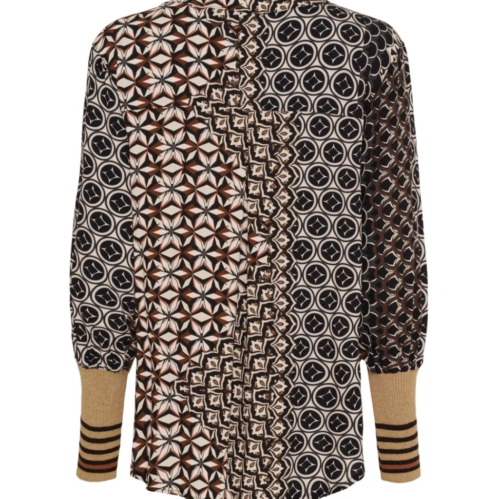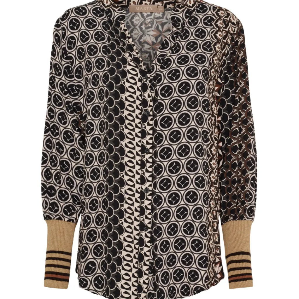 Smart printet skjorte fra Marta du Château med ribkant ved ærme. Skjorten har V-udskæring med en lille krave og gennemgående knapper. Kan styles med et par jeans og støvler eller sneakers.