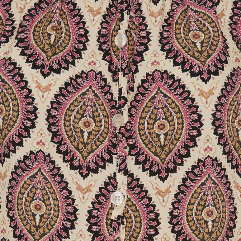 Fin bluse med elegant mønster fra Marta Du Cháteau. Blusen har diskrete knapper foran og elastik i halsen, så den også kan bruges off-shoulder. (Det kan have lidt betydning for brystmålet)