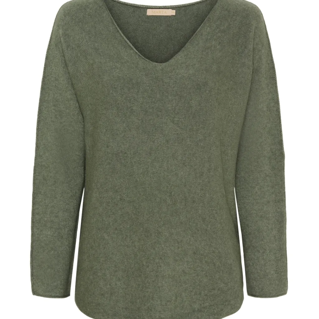 Dejlig blød striktrøje med v-hals. Strikken er super komfortabel og kan både bruges for sig selv eller med en blondetop under for en fin detalje ved halsen.