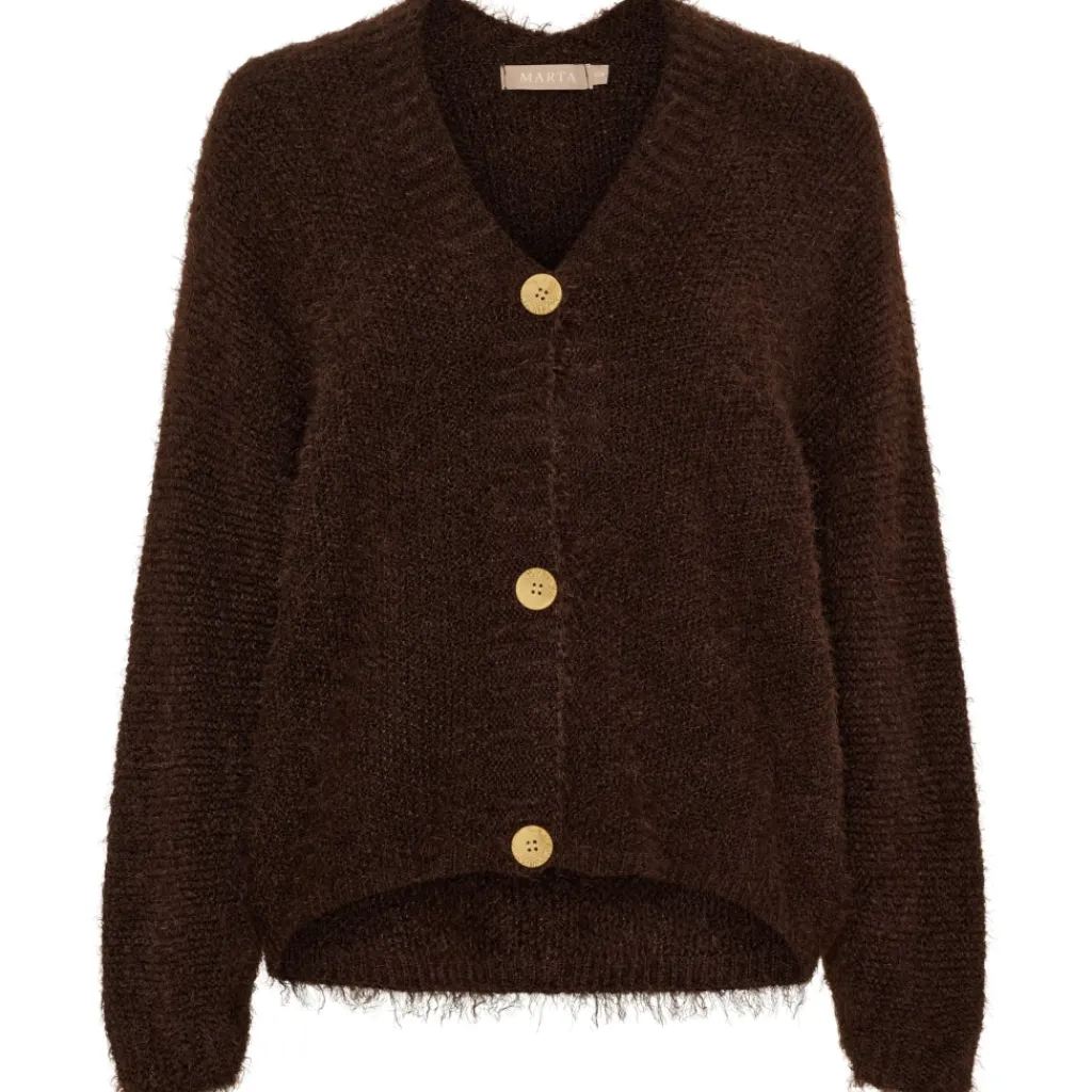 Super fin cardigan fra Marta du Château med løs pasform. Cardiganen har V-udskæring og gennemgående knapper. Denne passer helt perfekt til de koldere vinterdage med en skjorte eller bluse under.