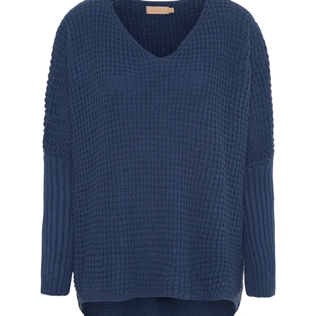 Lækker striktrøje med opsmøgede ærmer fra Marta du chateau. Længere bagtil end foran og med rund hals.