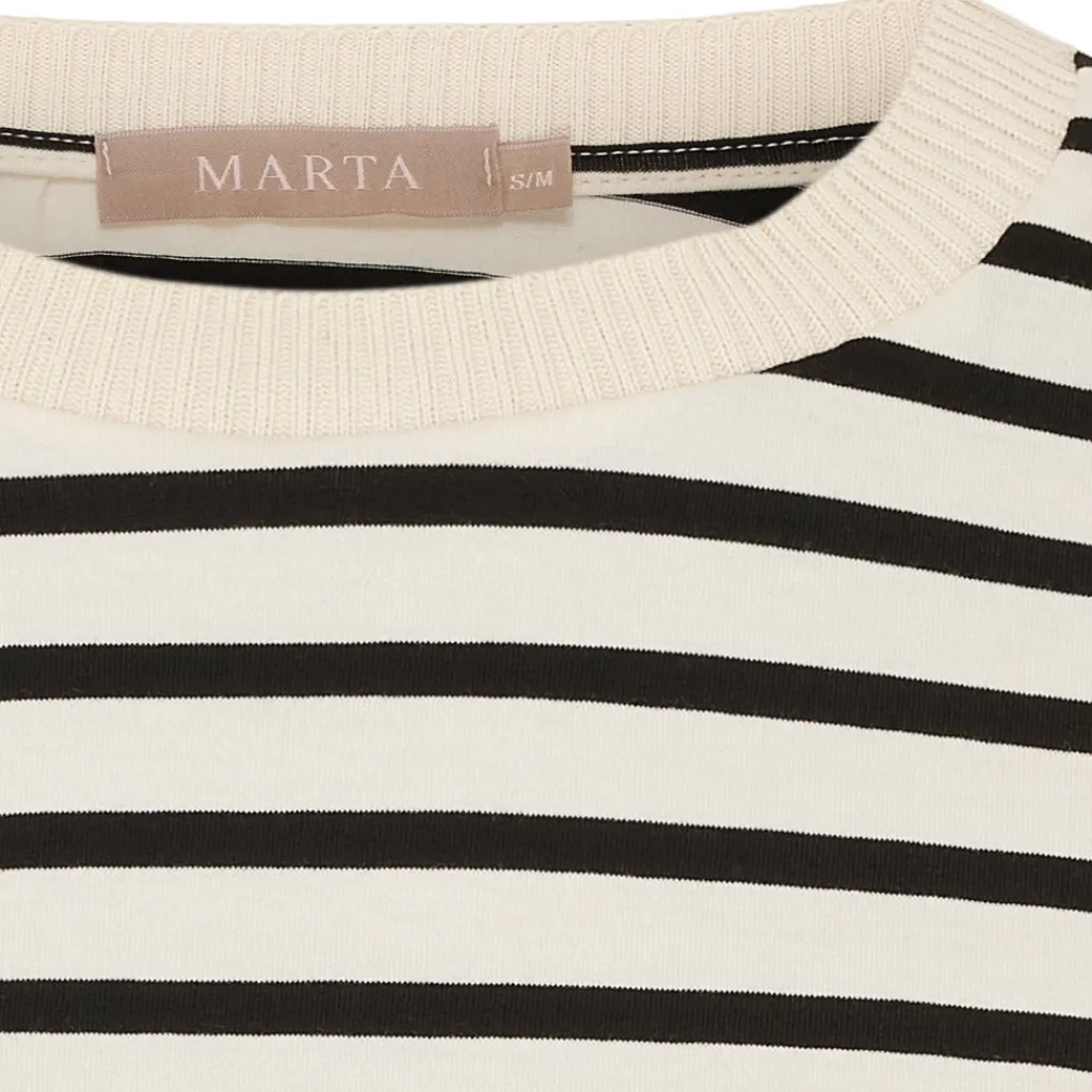 Basic og komfortabel stribet t-shirt fra Marta Du Château. Den har rund hals med ribkant og 3/4 lange ærmer. Ideel til hverdag med et par enten jeans, bukser eller nederdel.