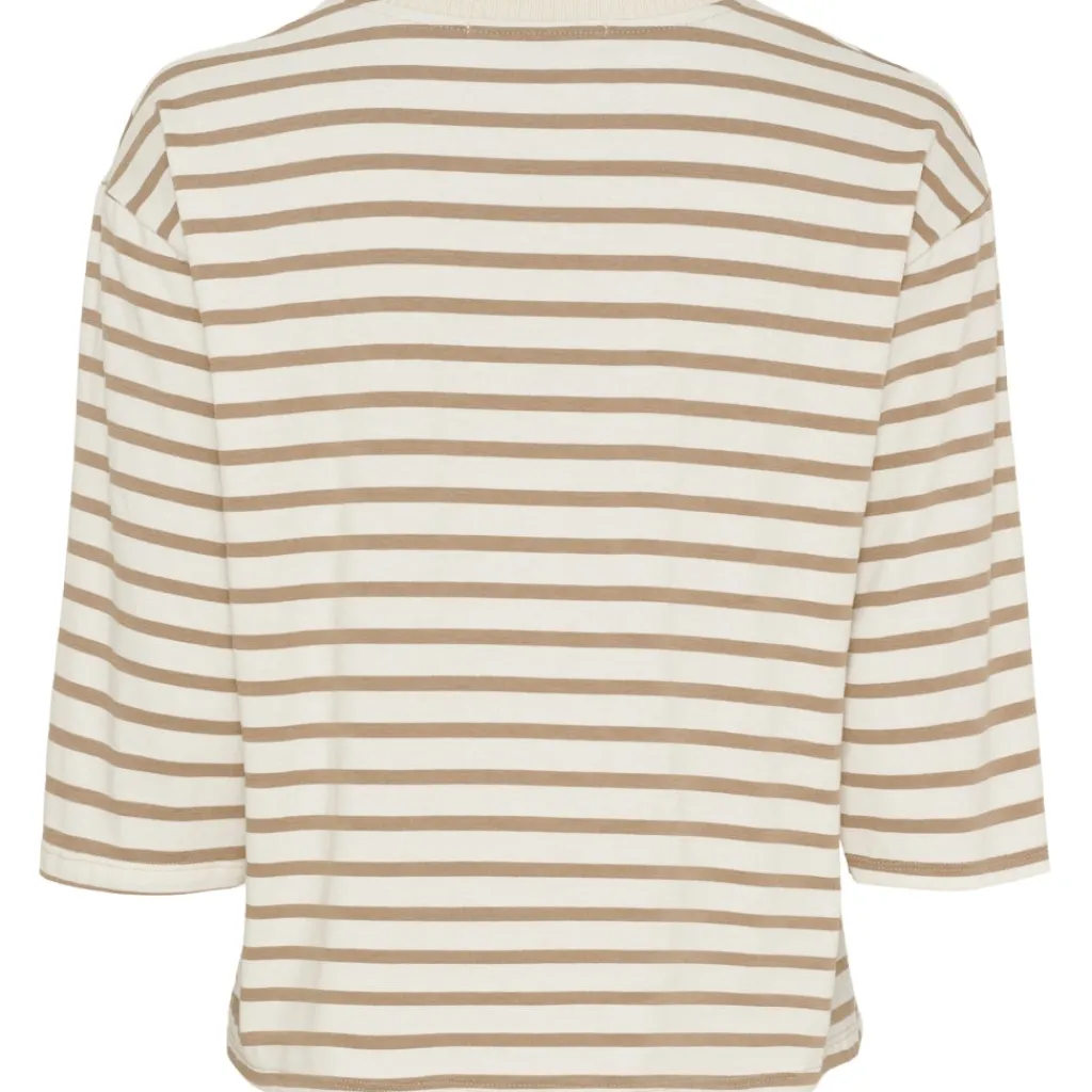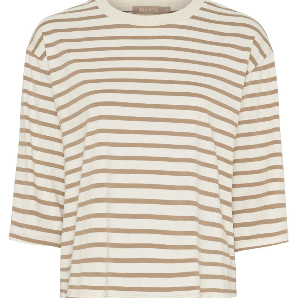 Basic og komfortabel stribet t-shirt fra Marta Du Château. Den har rund hals med ribkant og 3/4 lange ærmer. Ideel til hverdag med et par enten jeans, bukser eller nederdel.
