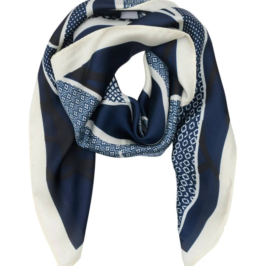 Elegant tørklæde med et moderne mønster. Ideelt til at pifte ethvert outfit op, uanset om det bruges om halsen, som hårpynt eller på tasken. En uundværlig accessory i garderoben efter vores mening.