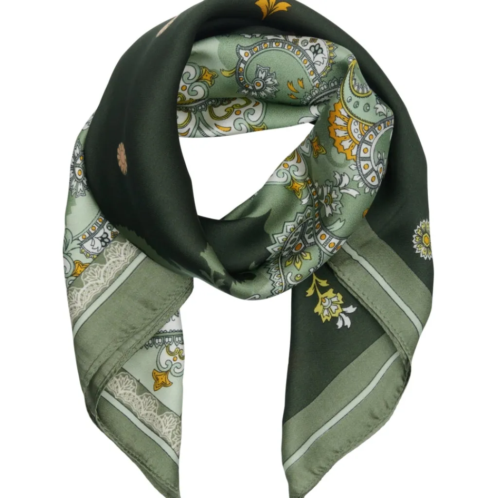 Elegant tørklæde med et moderne mønster. Ideelt til at pifte ethvert outfit op, uanset om det bruges om halsen, som hårpynt eller på tasken. En uundværlig accessory i garderoben efter vores mening.