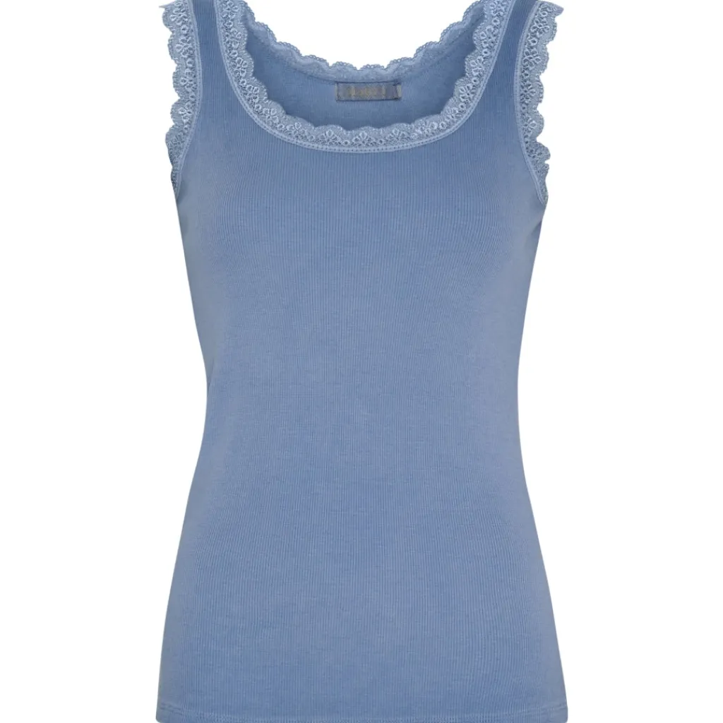 Feminin tanktop med fine blondedetaljer langs halsudskæringen og ærmegaberne. Fungerer som basislag eller til at style alene på varme dage.