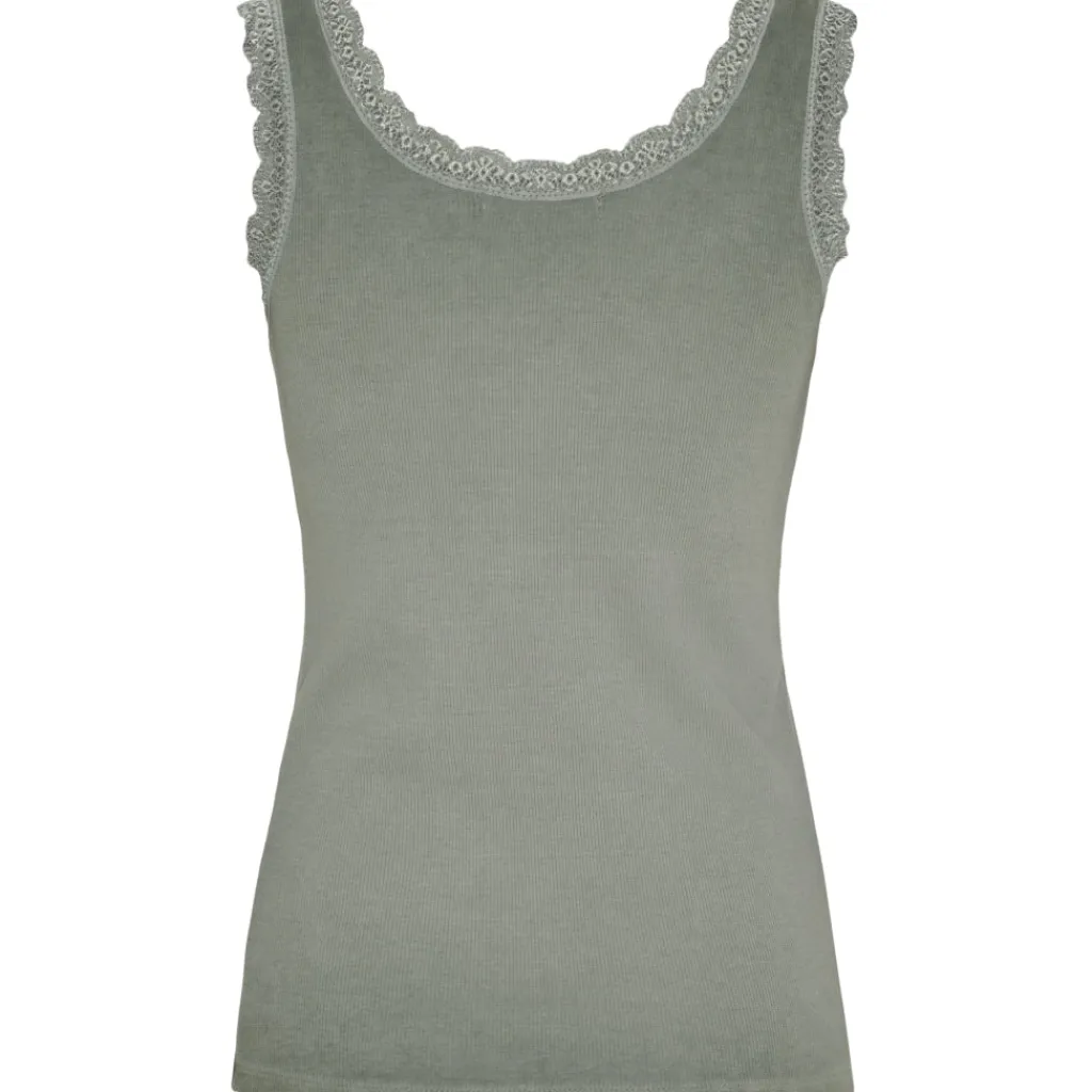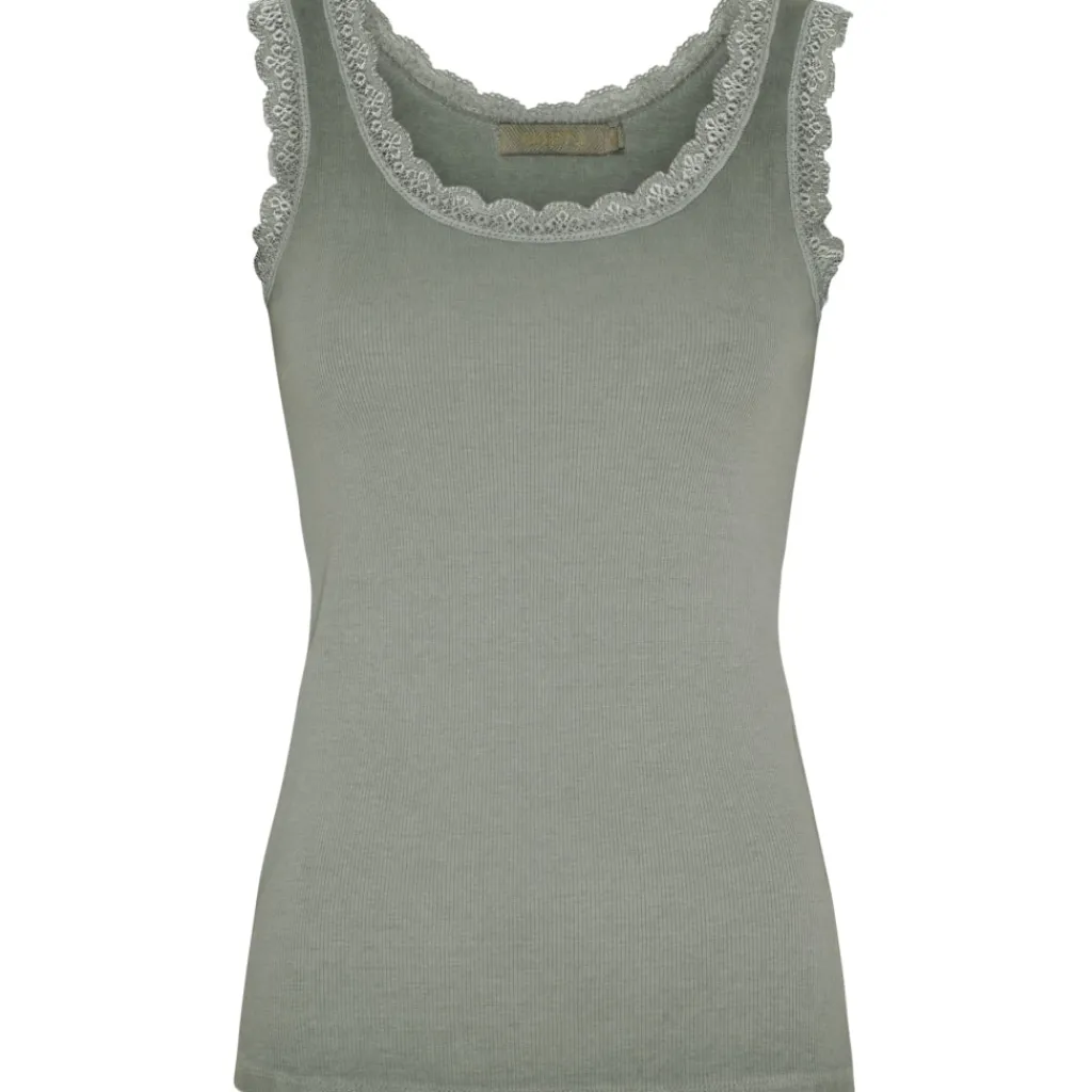Feminin tanktop med fine blondedetaljer langs halsudskæringen og ærmegaberne. Fungerer som basislag eller til at style alene på varme dage.
