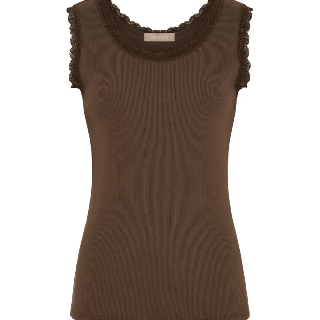 Feminin tanktop med fine blondedetaljer langs halsudskæringen og ærmegaberne. Fungerer som basislag eller til at style alene på varme dage.