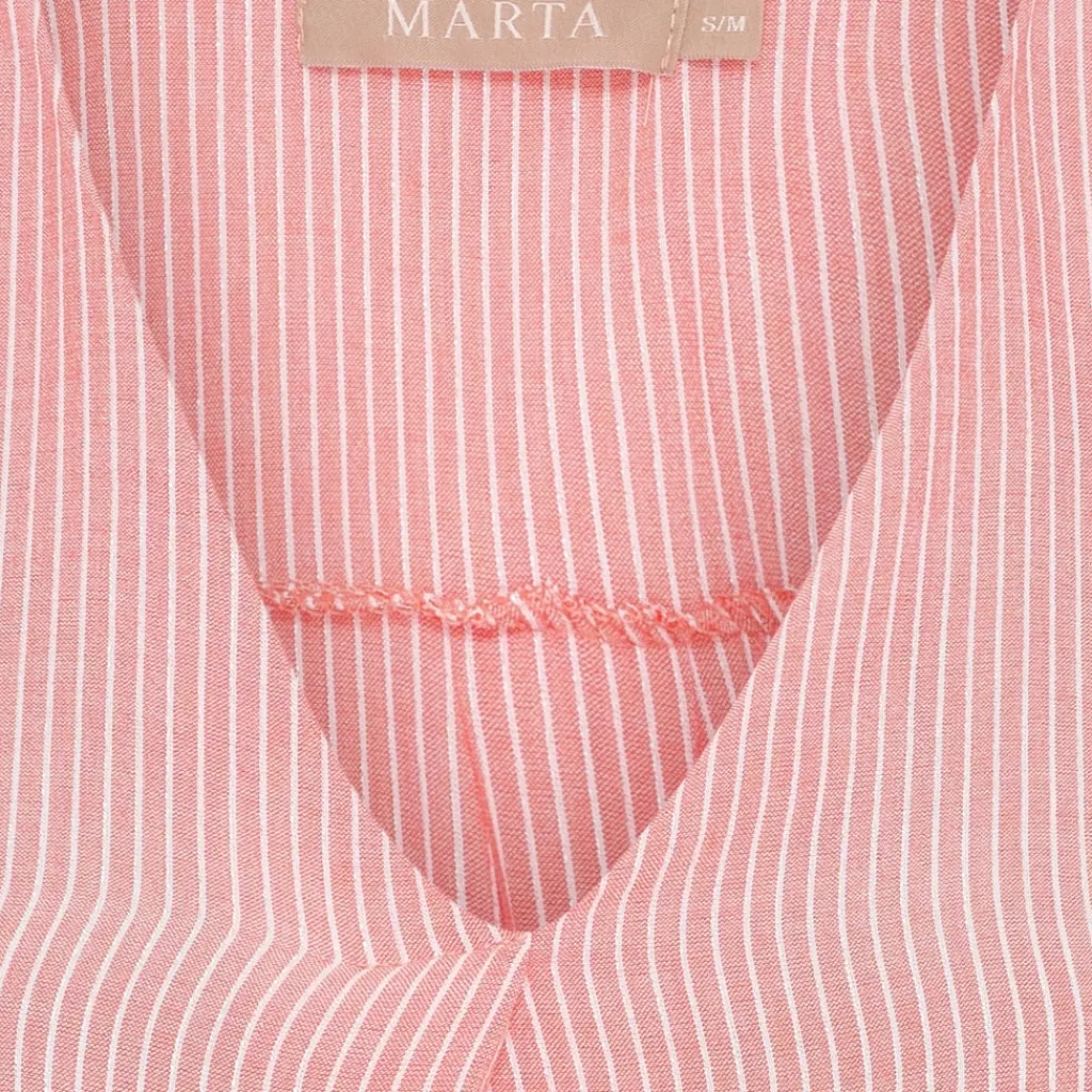 Sød stribet top fra Marta du Château med lurex tråd. Toppen har V-udskæring og flæse ved ærme. Perfekt til både hverdag og finere brug – nem at style med både shorts, nederdele og bukser.