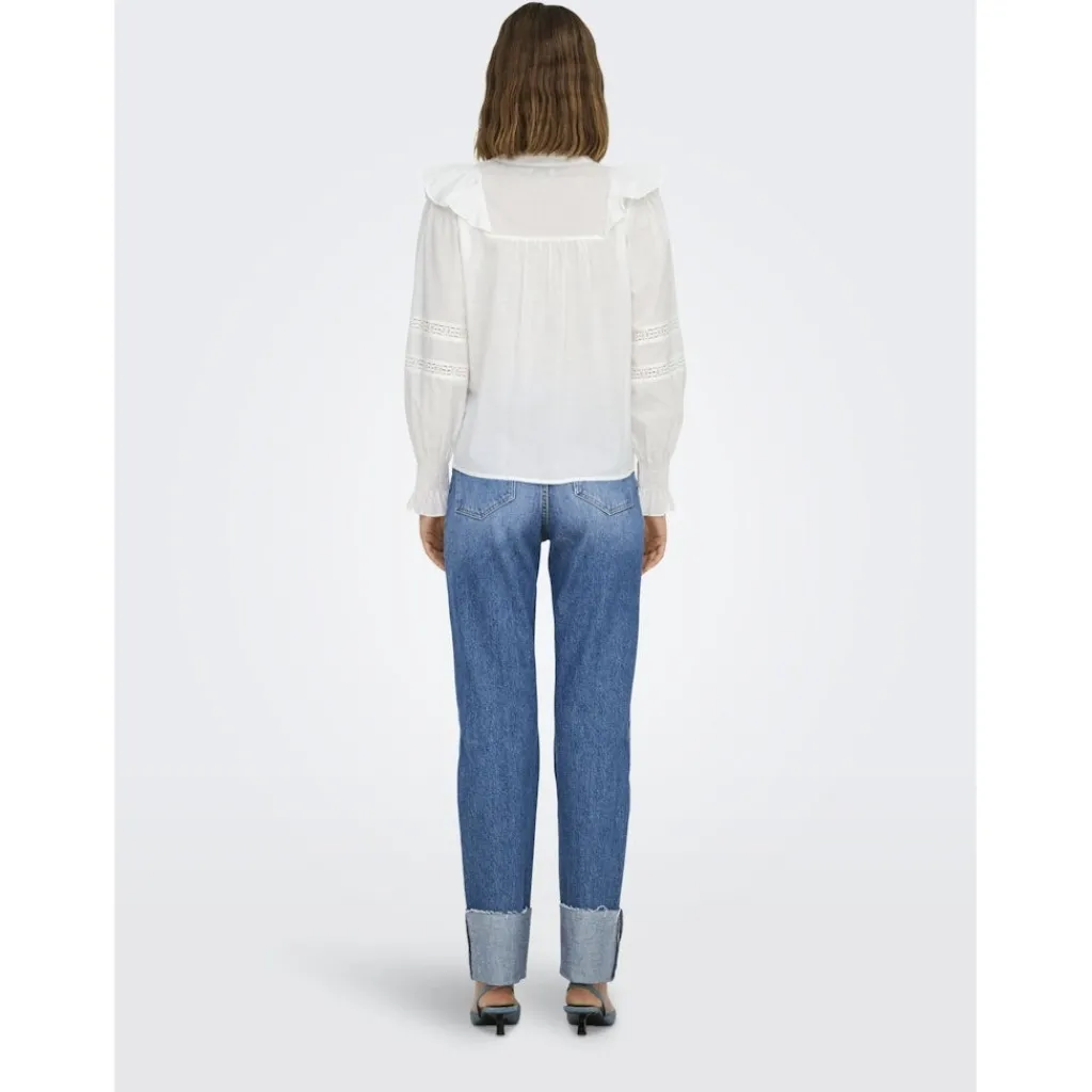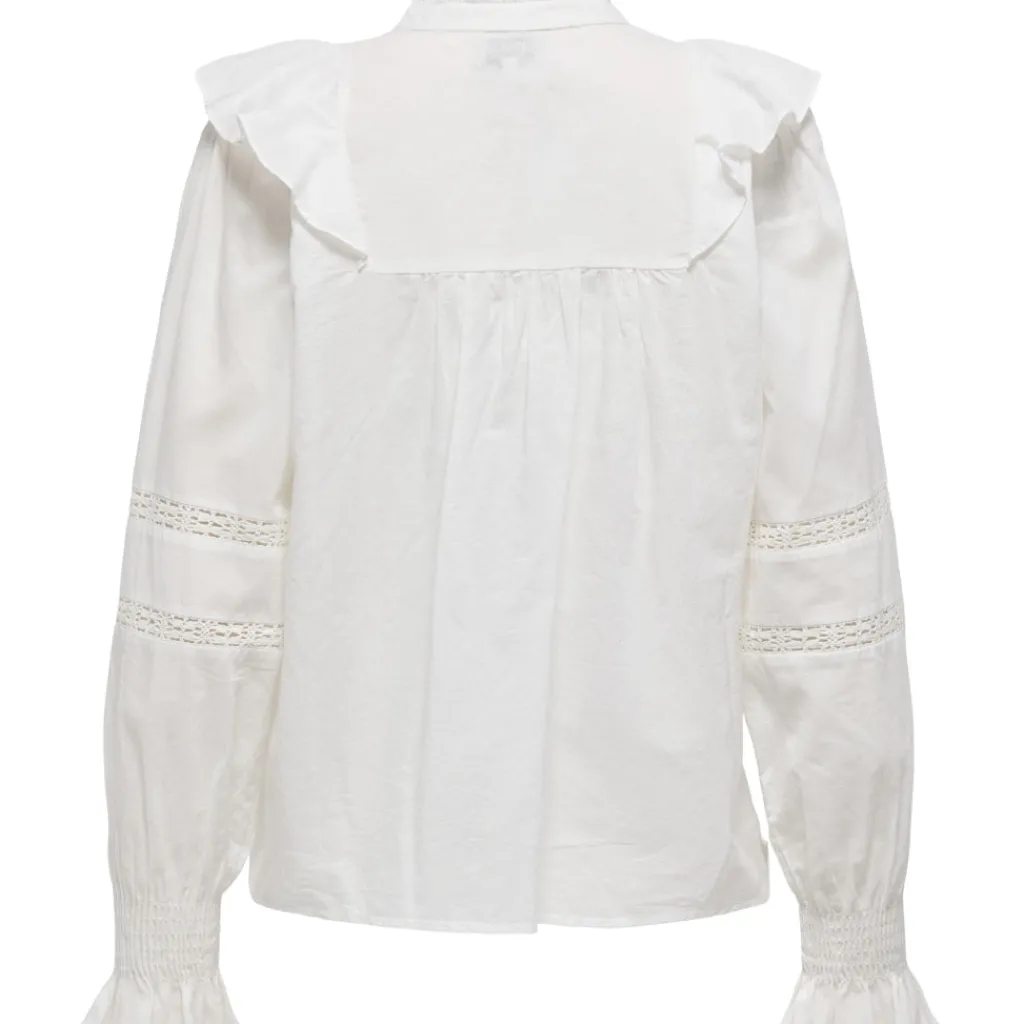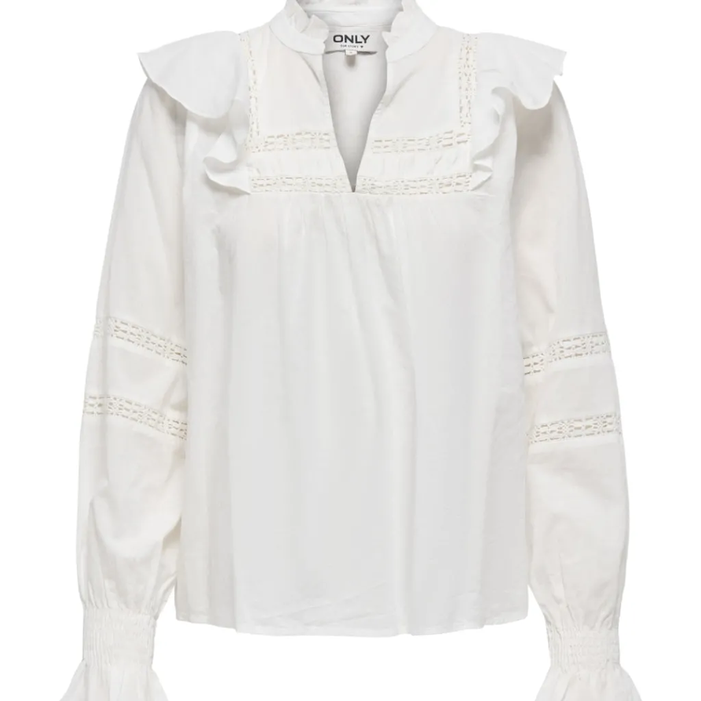 Fin blondebluse fra Only med flæsedetaljer, der skaber et romantisk udtryk. Normal i størrelsen.
