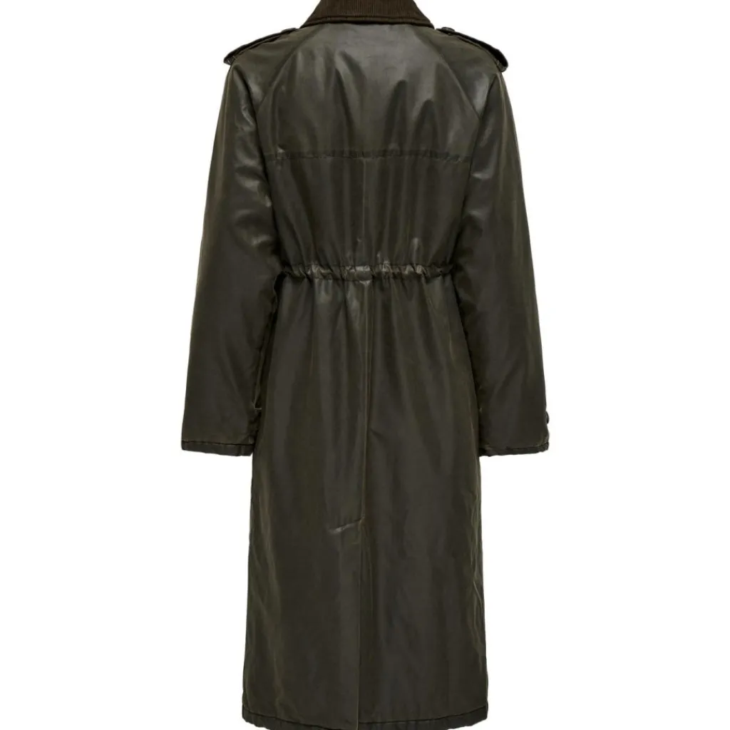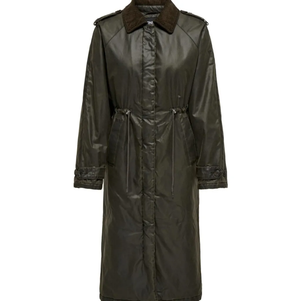 Cool jakke med krave og sidelommer fra Only. Jakken har fine detaljer som snørrer og en skinnende overflade.