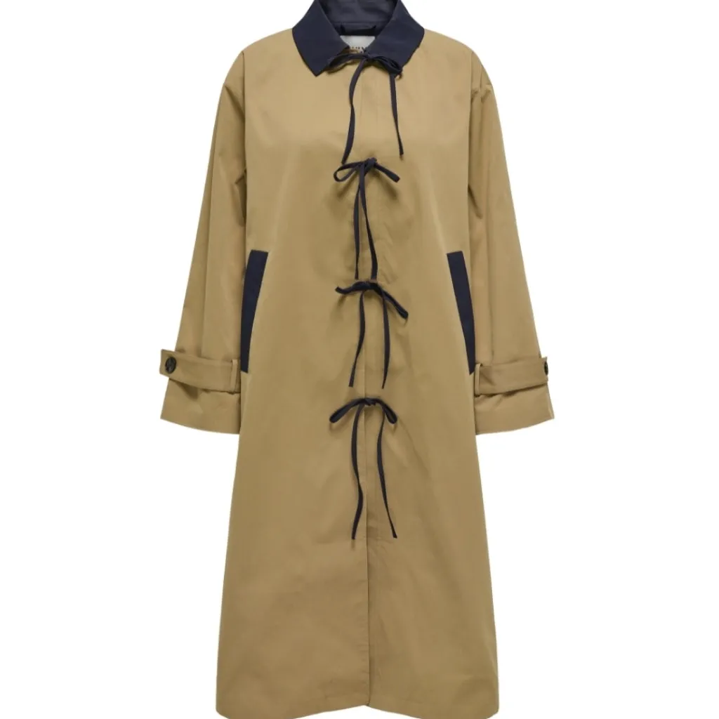 Sejeste trenchcoat fra Only. Jakken har de fedeste detaljer som kontrastfarvede lommer, krave og de sejeste sløjfer som lukning. Ideel som overgangsjakke til foråret og efteråret med en tyk strik under. Passer til ethvert outfit.