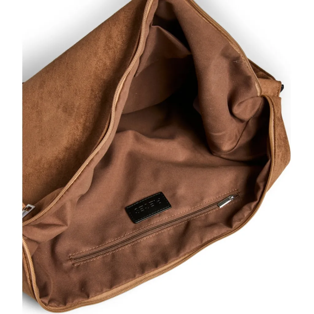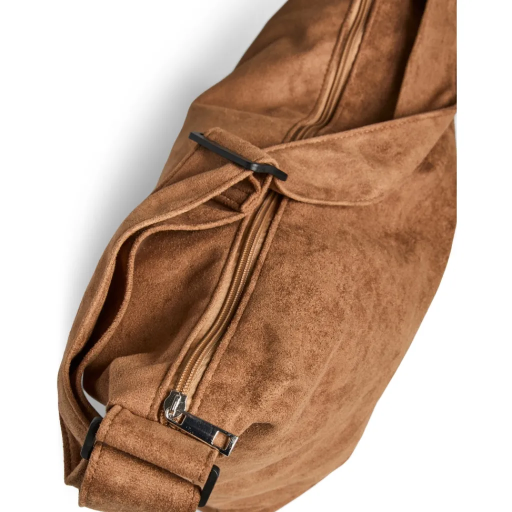 Sejeste suede taske fra Pieces med god rummelighed. Tasken har en justerbar rem, indvendig lomme med lynlås og to åbne lommer indvendig, samt lynlås-lukning.