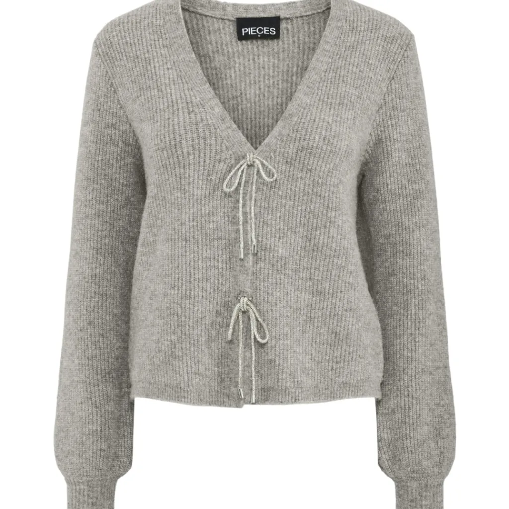 Smuk strikcardigan med sløjfer af små fine sten fra Pieces. Sløjfelukningen kan aftages. Super feminin og kan både bruges for sig selv eller med en basis t-shirt eller langærmet under for et fint lag-på-lag look.