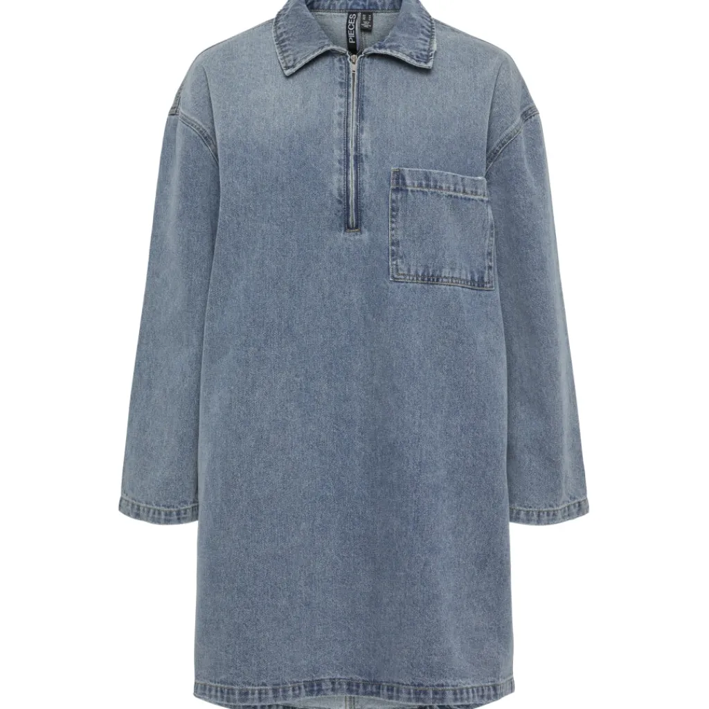 Sej denimkjole med krave, lynlås og en brystlomme i den ene side fra Pieces. Style den evt. med et par tights under og et par støvler til.