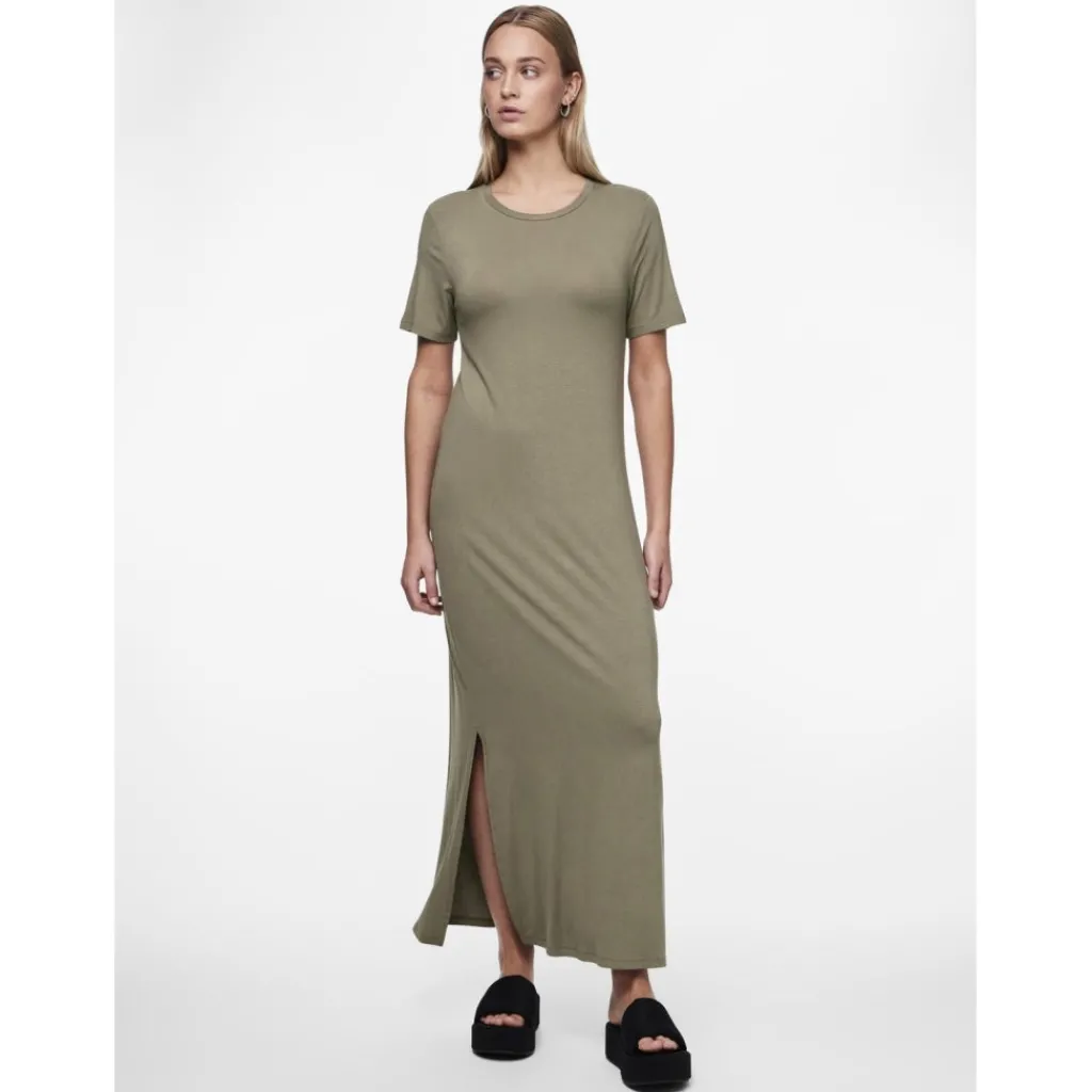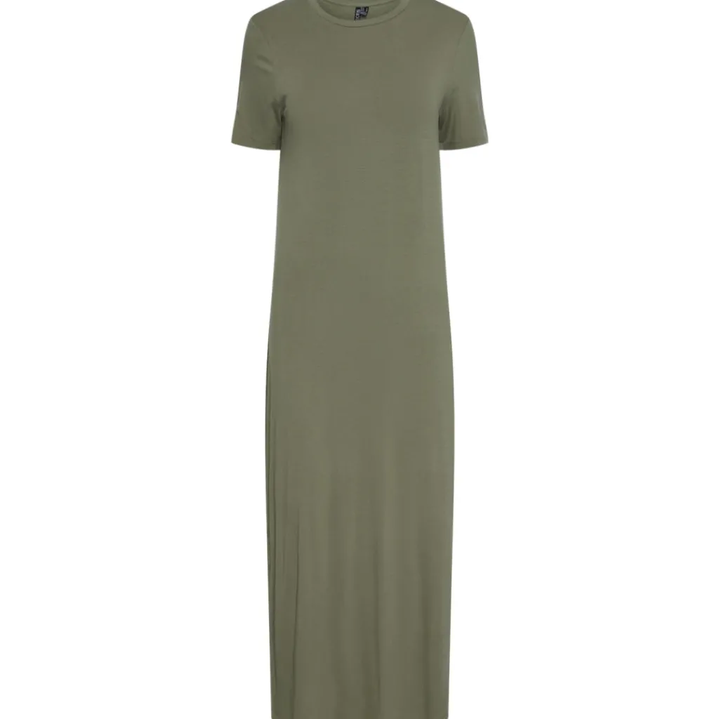 Lang smørblød t-shirt kjole fra Pieces. Kjolen har et fint lille slids i den ene side, og den kan både dresses op og ned efter anledning. For et casual hverdagslook, style den med et par sandaler eller sneakers. For et finere look, style den med et par slingsbacks og en fin taske.