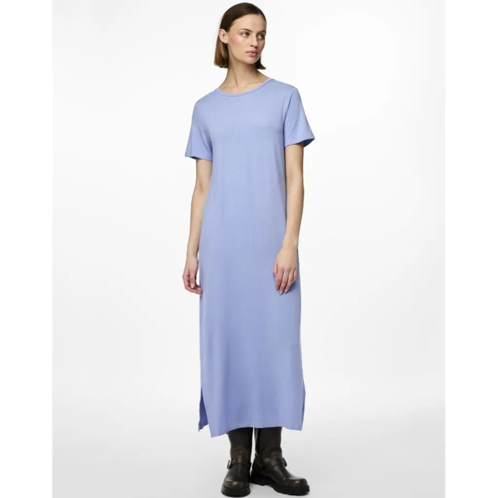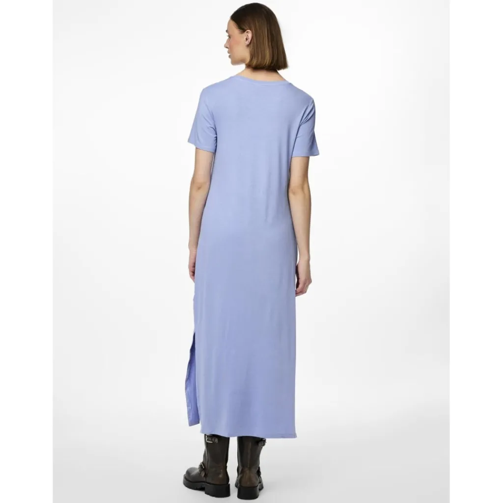 Lang smørblød t-shirt kjole fra Pieces. Kjolen har et fint lille slids i den ene side, og den kan både dresses op og ned efter anledning. For et casual hverdagslook, style den med et par sandaler eller sneakers. For et finere look, style den med et par slingsbacks og en fin taske.