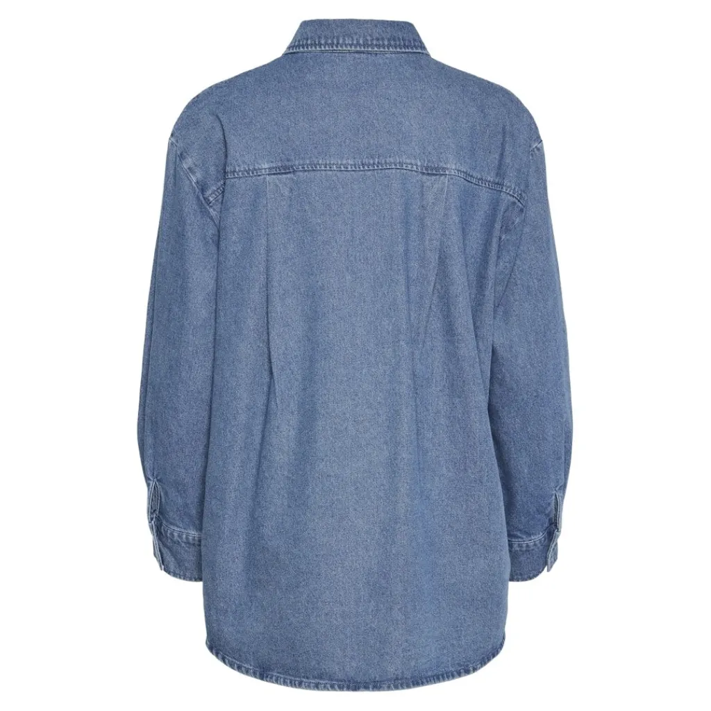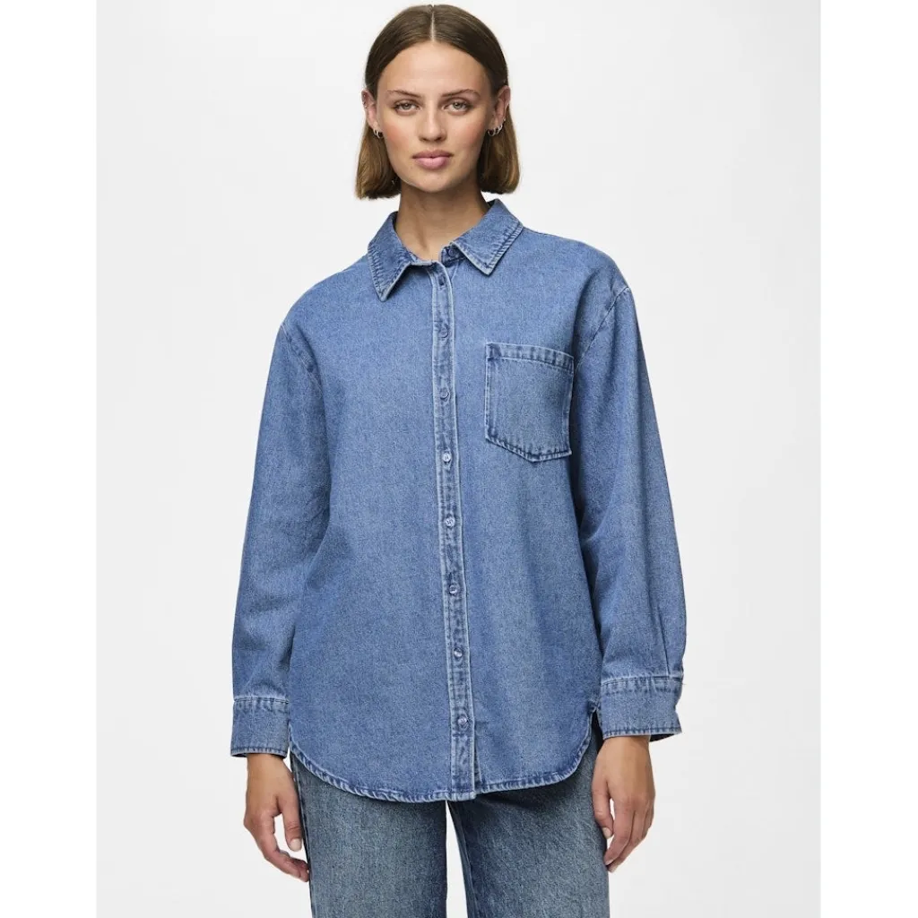 Sej denimskjorte fra Pieces med lomme på det ene bryst og små slidser i siden nederst. Perfekt til hverdagsbrug.