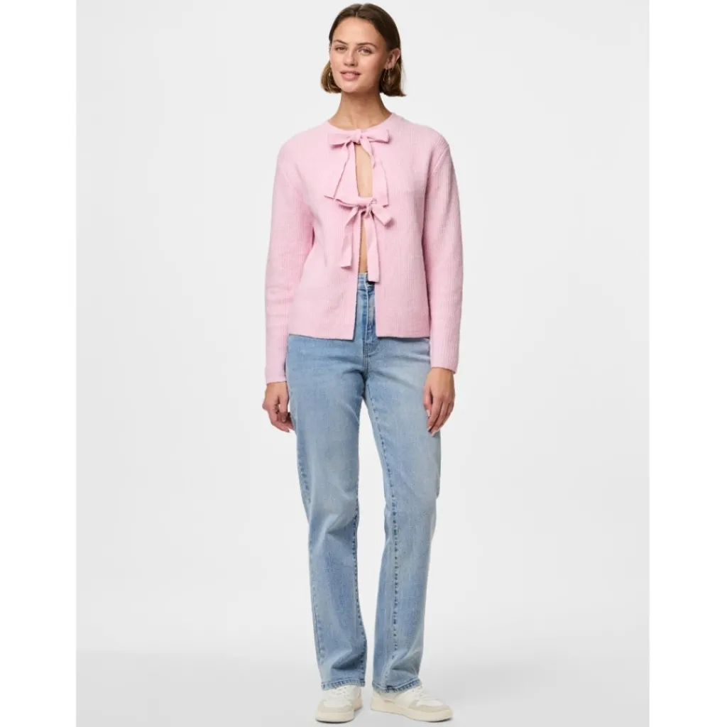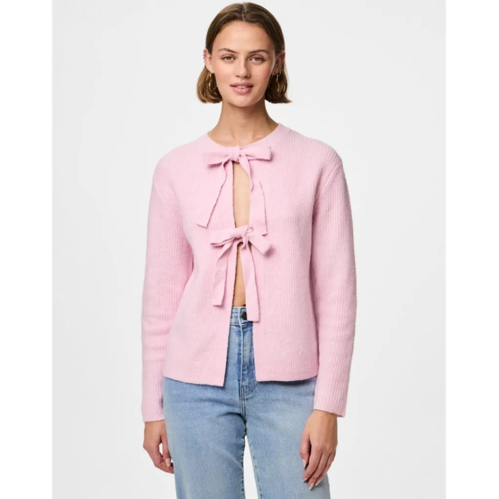 Smuk, blød striktrøje med bindebånd. Trøjen kan vendes om, så båndene sidder på ryggen. Super trendy og nem at style.