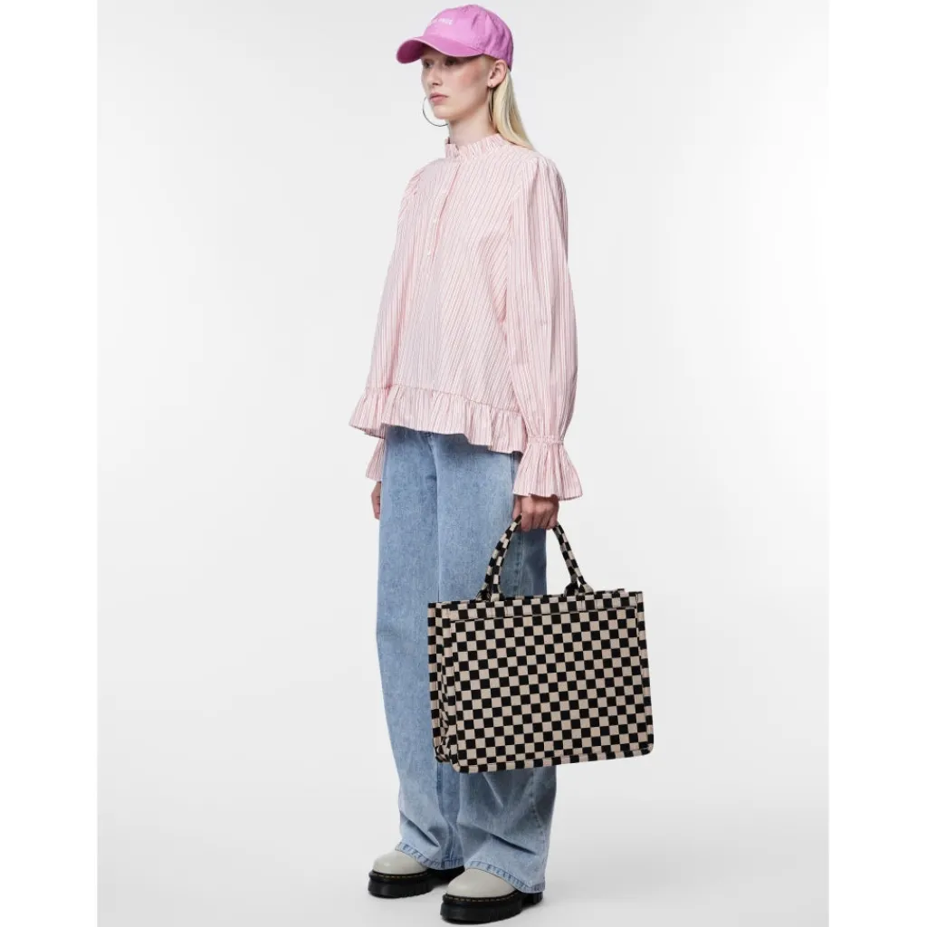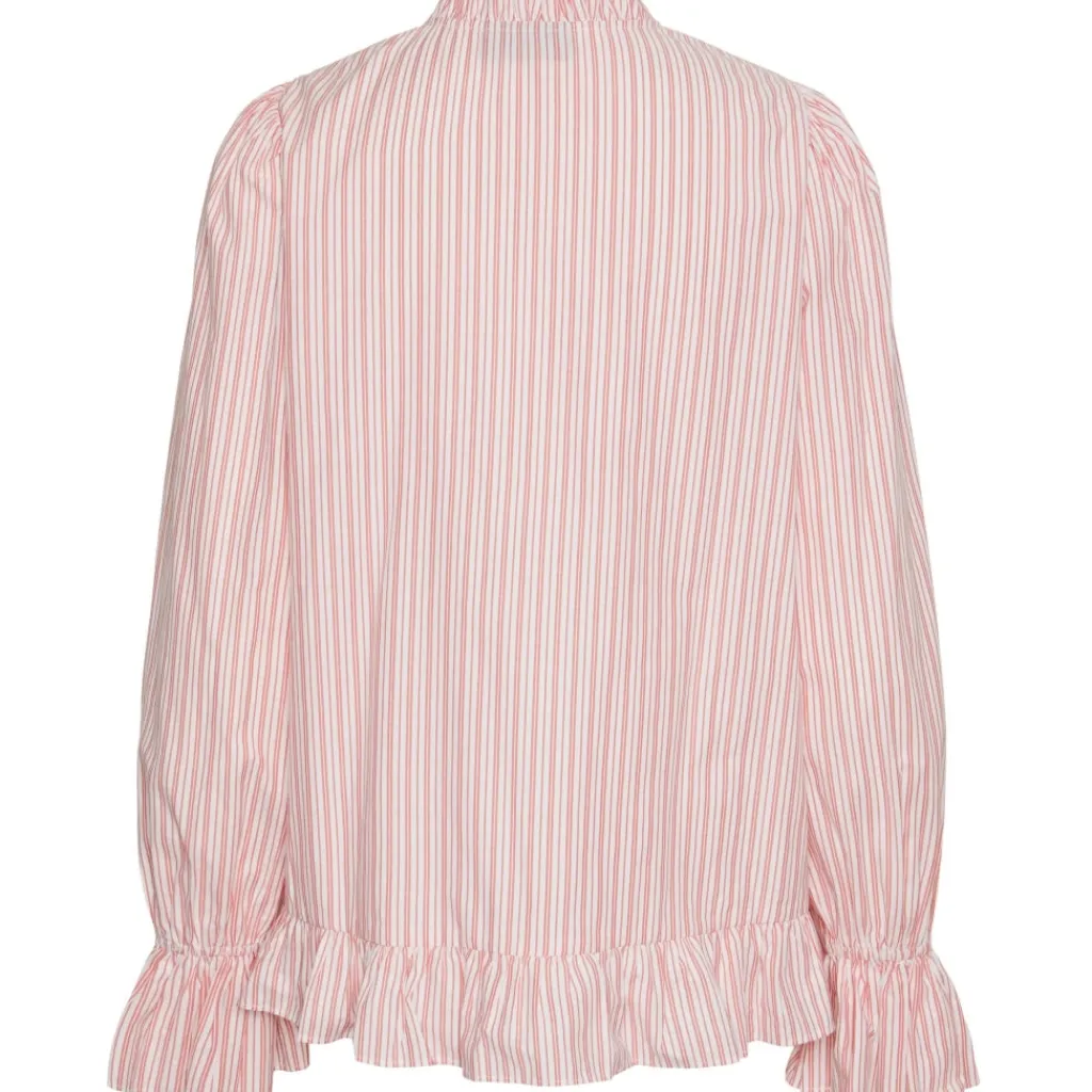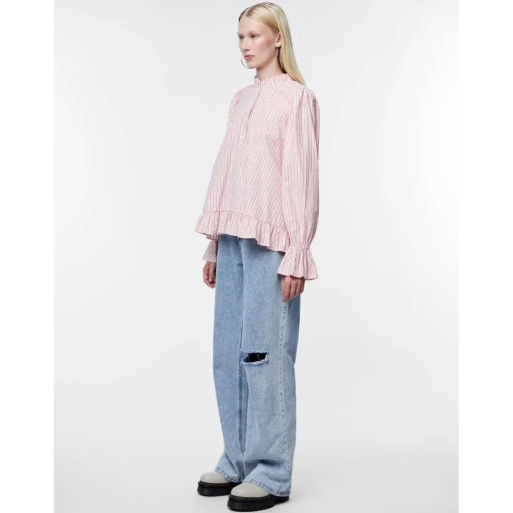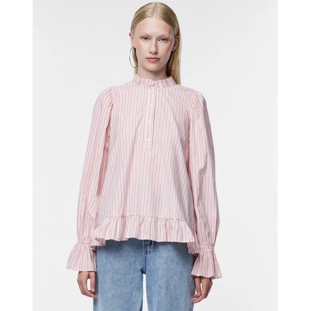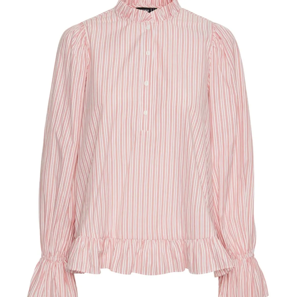 Smuk bluse med flæsedetaljer fra Pieces. Blusen har fine knapper og er højhalset, og er helt normal i størrelsen.