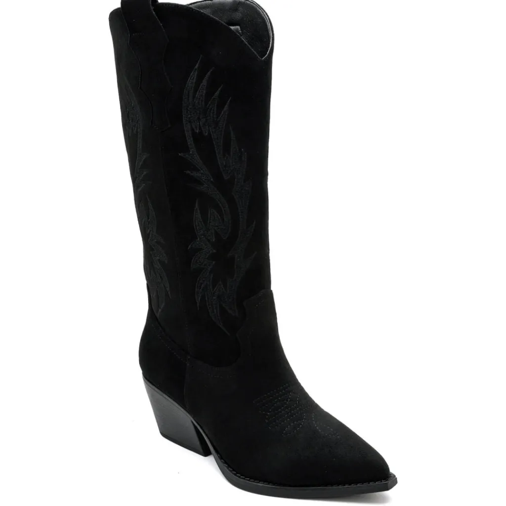 Super sej imiteret ruskinds cowboystøvle med de fedeste detaljer. Støvlerne har en høj skaft, blokhæl og lynlås på indersiden. De kan styles til enhver lejlighed – brug den med en kjole og strømpebukser eller til et par jeans og blazer.
