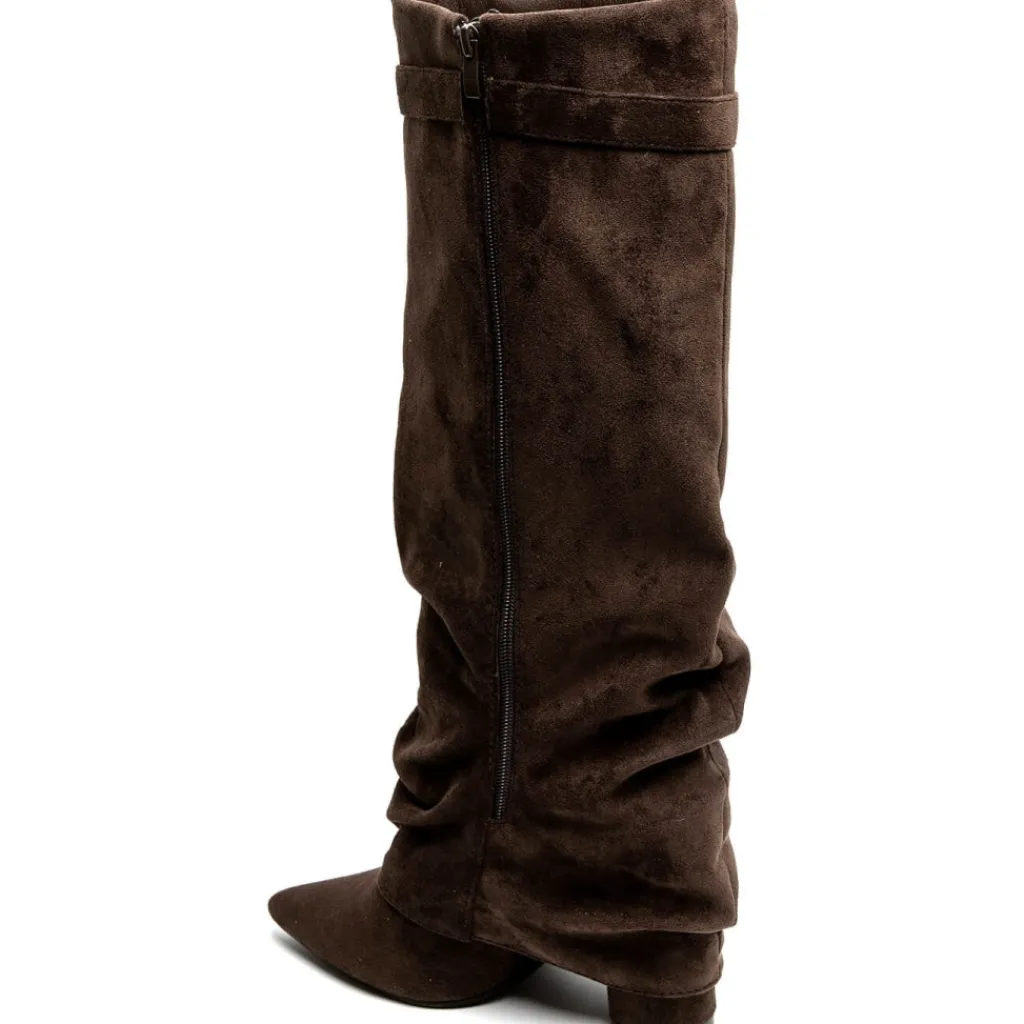 Cool højskaftet støvle med spids snude i imiteret ruskind, perfekt til både hverdag og fest.