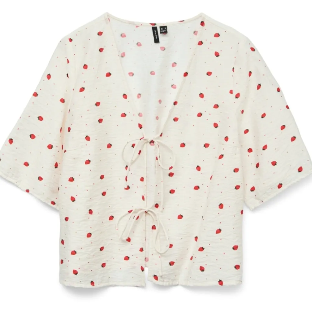 Den fineste bluse med frugtmotiver og bindebånd fra Vero Moda. Blusen skriger på sommer, og kan fint styles med matchende shorts for et komplet, feminint look.