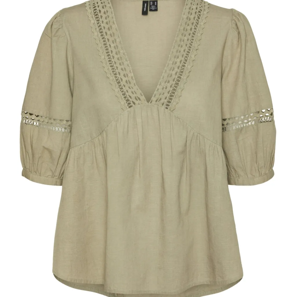 Sød top med dyb v-hals fra Vero Moda. Toppen har de fineste detaljer som hulmønster og en lille flæsekant langs brystet.