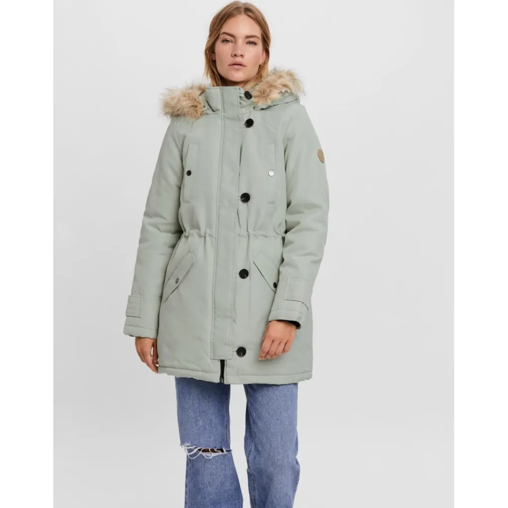 Smart parka vinterjakke fra Vero Moda med hætte og aftagelig fake pels. Jakken har lommer ved brystet, samt snørre ved livet.