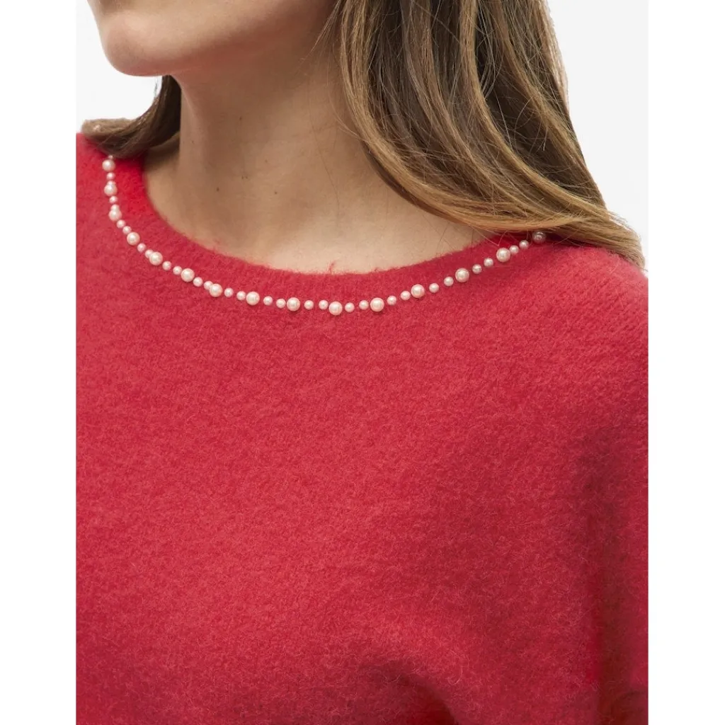 Smuk striktrøje fra Vila med fint perlebroderi. Striktrøjen har en normal pasform med løse ærmer. Denne strik er helt perfekt til de kolde vinterdage.